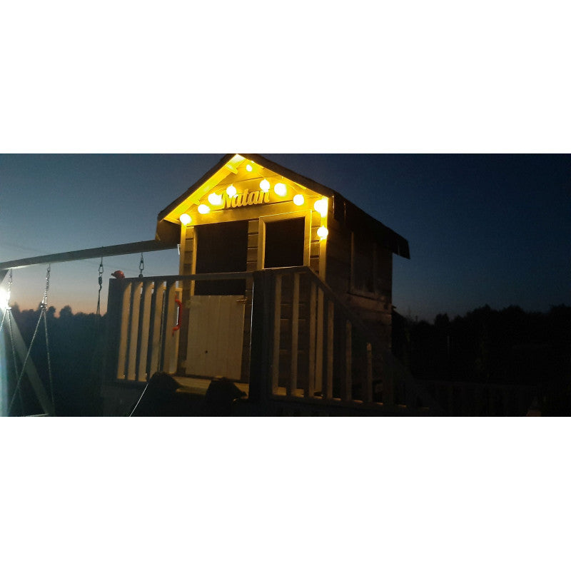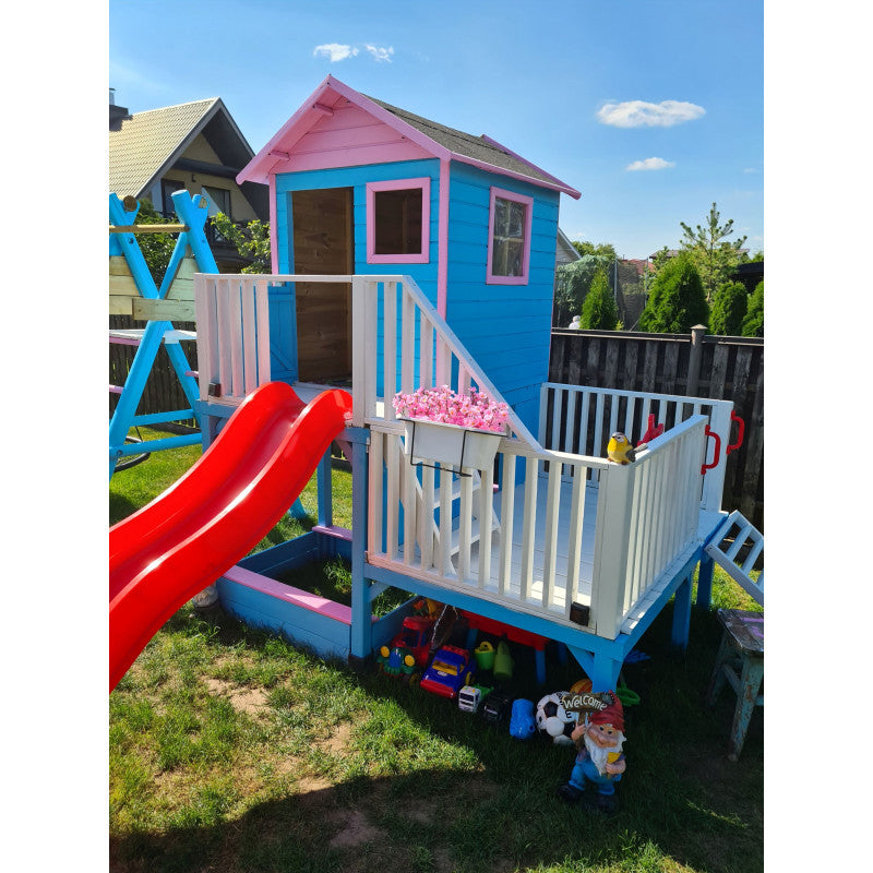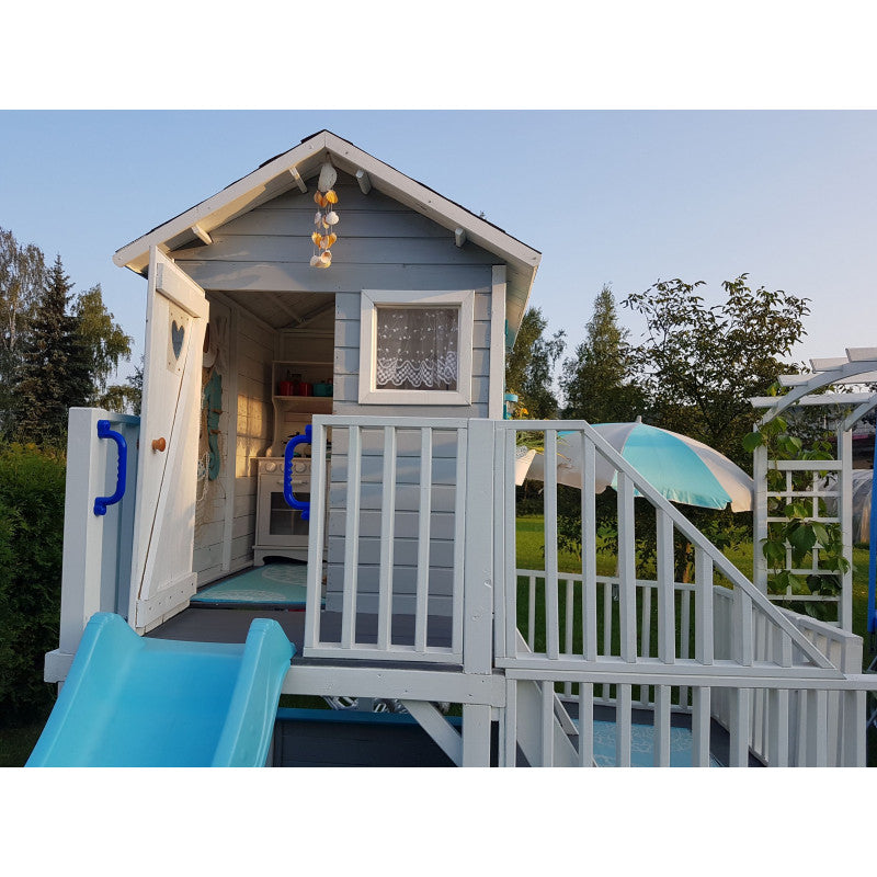 • Erweiterungen (im Set enthalten): 2 Rutschen am Haus; Anbau mit Doppelschaukel, zusätzlicher Plattform und weiterer Rutsche; Kletterwand; Verbindungs-Verstärkung (2 Bretter 28 × 115 × 1100 mm, innen verschraubt)