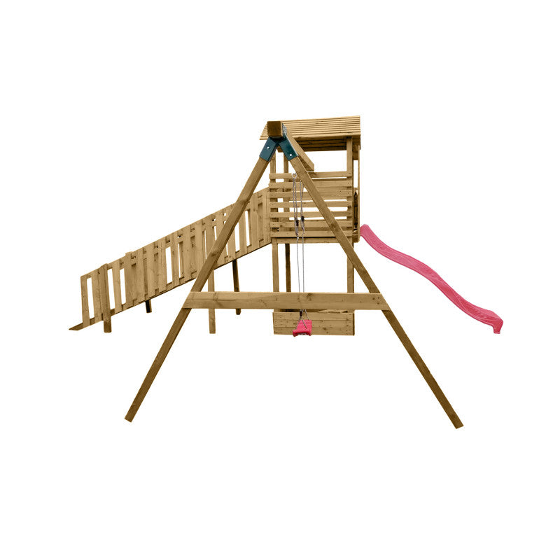 Abenteuerturm „Hugo“ aus imprägnierter Kiefer – mit Schaukel, breiter Rampe & Rutsche, 580×335×275 cm