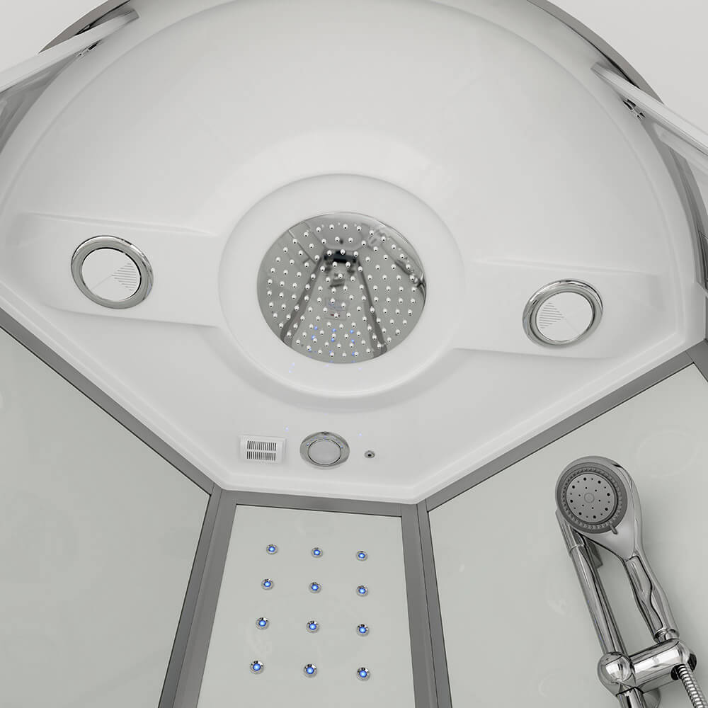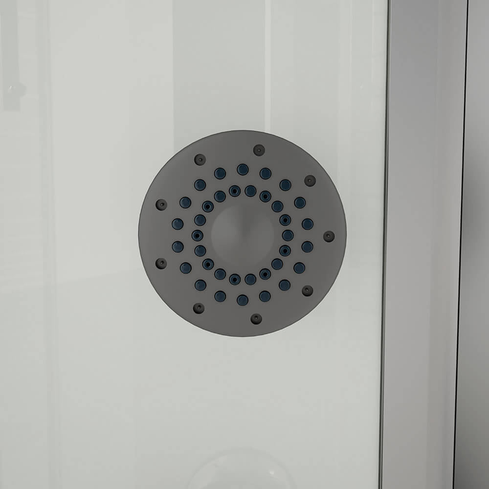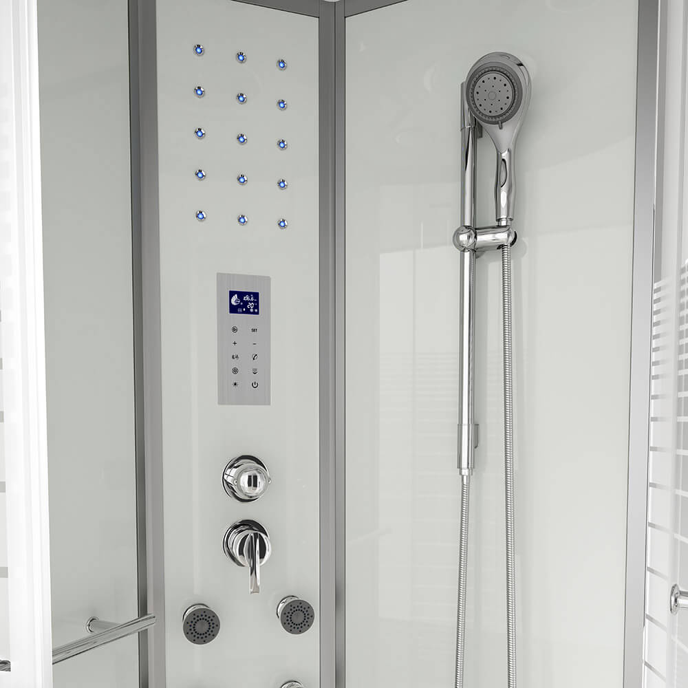 Verliere zum Beispiel nach einem mühsamen Arbeitstag deinen Stress bei einem angenehmen Dampfsaunagang (bis 40 °C einstellbar), bei dem du garantiert ins Schwitzen kommst. Optional besteht für dich die Möglichkeit, ein Duftaroma von himmlischer Intensität (z. B. Eukalyptus, Minze u.v.a.) zu integrieren. Unsere "ALBA-Serie" verfügt außerdem über die Regenbrausenoption, bei der Wasser wie ein lauwarmer Tropenregen aus den unglaublichen 126 Düsen im Deckenhimmel rieselt. Eine entspannte Rückenmassage (6 Hydrojets) mit gleichzeitigem Lauschen deines Lieblingsradiosenders ist bei vielen Kunden beliebt. Selbstverständlich ist auch der gewöhnliche Gebrauch über eine Handbrause, die über die befestigte Duschstange justierbar ist, möglich. Die 15 blauen LED-Lichter im Mittelpaneel machen den "Wohlfühlfaktor" vollkommen. Über das integrierte Computerdisplay kannst du die Lautstärke und Senderwahl stufenlos regeln. Der im Mittelpaneel aufklappbare Sitz (max. Belastung ca. 100 kg) und die Antirutschstruktur im Wannenboden gewährleisten deinen sicheren Gebrauch dieser Duschkabine. Die 5 mm ESG-Vollverglasung aller Komponenten steht für unseren durchweg hohen Qualitätsstandard. Die hochmoderne Teilsatinierung schafft sowohl Diskretion als auch Lichtdurchlässigkeit. Die auf fast jeden Untergrund anzupassenden höhenverstellbaren Füße der Duschwanne sind ein weiteres herausragendes Feature, das diese Dusche von anderen hervorhebt.