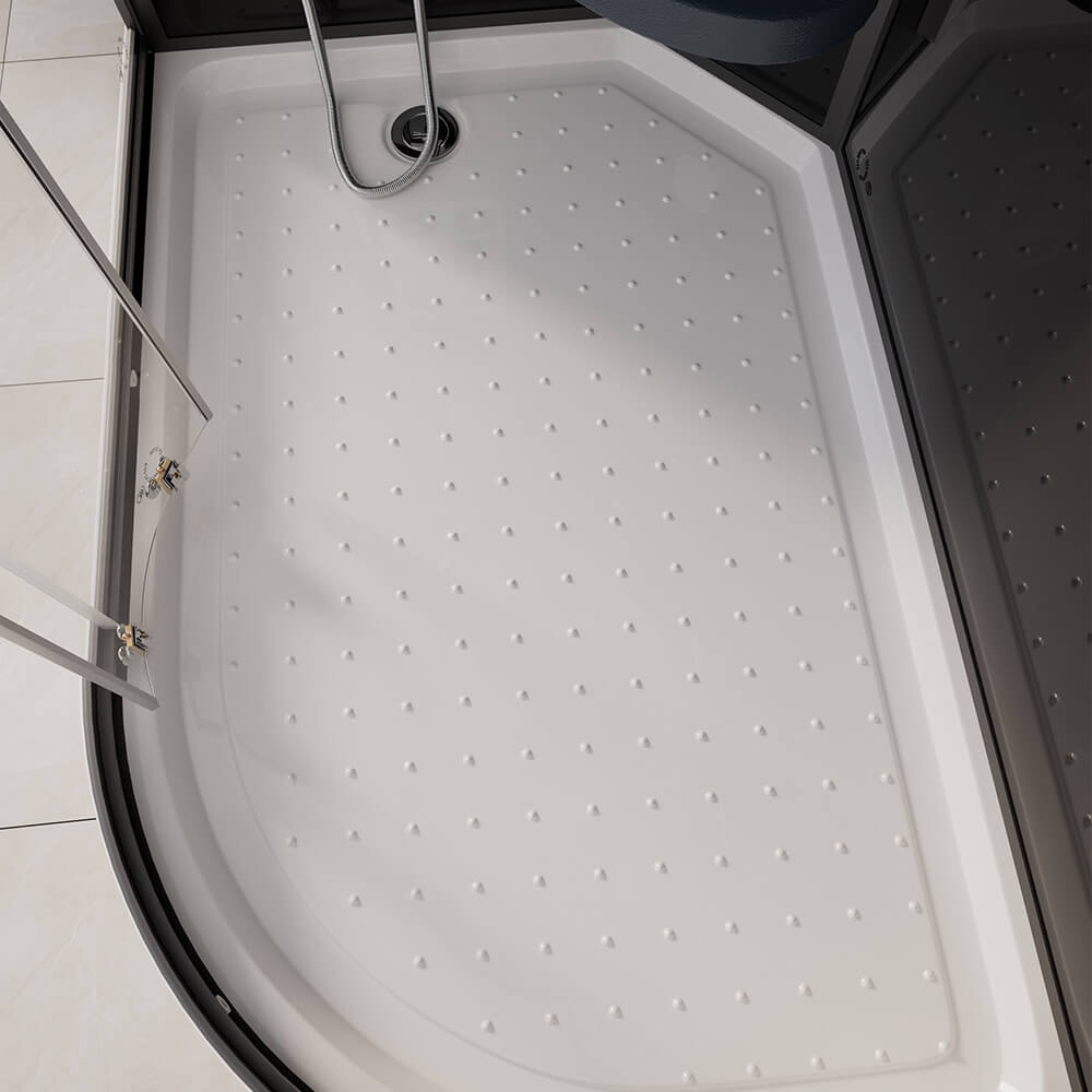 Verliere zum Beispiel nach einem mühsamen Arbeitstag deinen Stress bei einem angenehmen Dampfsaunagang (bis 40 °C einstellbar), bei dem du garantiert ins Schwitzen kommst. Optional besteht für dich die Möglichkeit, ein Duftaroma von himmlischer Intensität (z. B. Eukalyptus, Minze u.v.a.) zu integrieren. Unsere "ONYX -Serie" verfügt außerdem über die Regenbrausenoption, bei der Wasser wie ein lauwarmer Tropenregen aus den unglaublichen 126 Düsen im Deckenhimmel rieselt. Eine entspannte Rückenmassage (6 Hydrojets) mit gleichzeitigem Lauschen deines Lieblingsradiosenders ist bei vielen Kunden beliebt. Selbstverständlich ist auch der gewöhnliche Gebrauch über eine Handbrause, die über die befestigte Duschstange justierbar ist, möglich. Die 15 blauen LED-Lichter im Mittelpaneel machen den "Wohlfühlfaktor" vollkommen. Über das integrierte Computerdisplay kannst du die Lautstärke und Senderwahl stufenlos regeln. Der im Mittelpaneel aufklappbare Sitz (max. Belastung ca. 100 kg) und die Antirutschstruktur im Wannenboden gewährleisten deinen sicheren Gebrauch dieser Duschkabine. Die 5 mm schwarzgetönte ESG-Vollverglasung aller Komponenten steht für unseren durchweg hohen Qualitätsstandard. Die hochmoderne Teilsatinierung schafft sowohl Diskretion als auch Lichtdurchlässigkeit. Die auf fast jeden Untergrund anzupassenden höhenverstellbaren Füße der Duschwanne sind ein weiteres herausragendes Feature, das diese Dusche von anderen hervorhebt.