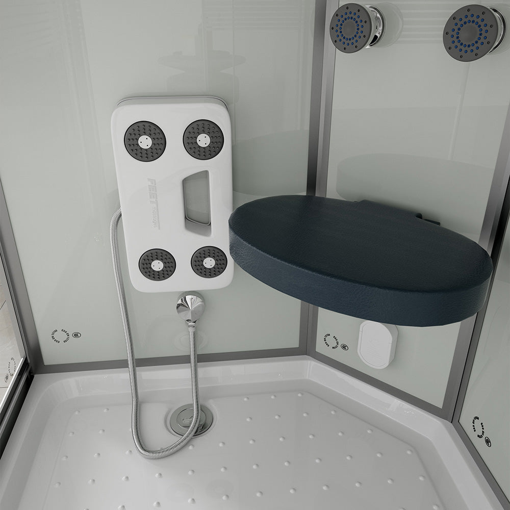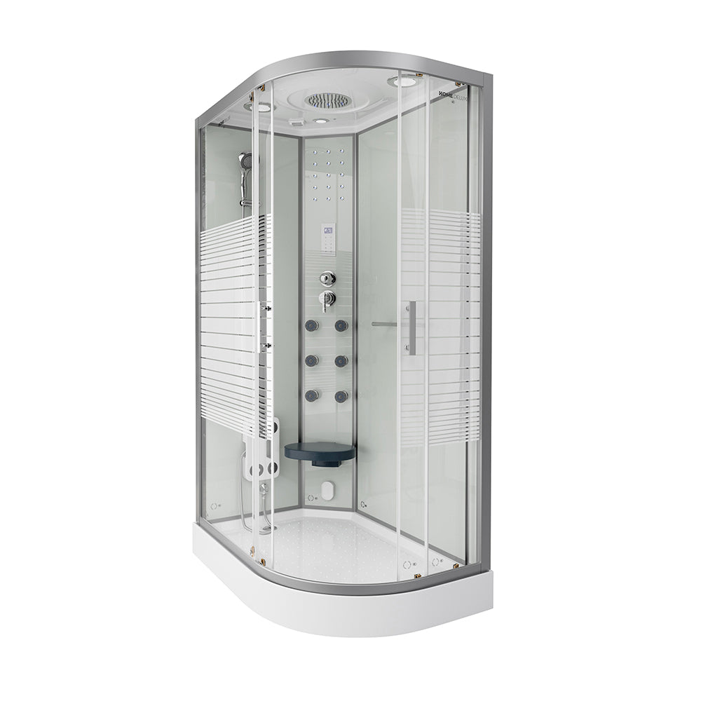 Verliere zum Beispiel nach einem mühsamen Arbeitstag deinen Stress bei einem angenehmen Dampfsaunagang (bis 40 °C einstellbar), bei dem du garantiert ins Schwitzen kommst. Optional besteht für dich die Möglichkeit, ein Duftaroma von himmlischer Intensität (z. B. Eukalyptus, Minze u.v.a.) zu integrieren. Unsere "ALBA-Serie" verfügt außerdem über die Regenbrausenoption, bei der Wasser wie ein lauwarmer Tropenregen aus den unglaublichen 126 Düsen im Deckenhimmel rieselt. Eine entspannte Rückenmassage (6 Hydrojets) mit gleichzeitigem Lauschen deines Lieblingsradiosenders ist bei vielen Kunden beliebt. Selbstverständlich ist auch der gewöhnliche Gebrauch über eine Handbrause, die über die befestigte Duschstange justierbar ist, möglich. Die 15 blauen LED-Lichter im Mittelpaneel machen den "Wohlfühlfaktor" vollkommen. Über das integrierte Computerdisplay kannst du die Lautstärke und Senderwahl stufenlos regeln. Der im Mittelpaneel aufklappbare Sitz (max. Belastung ca. 100 kg) und die Antirutschstruktur im Wannenboden gewährleisten deinen sicheren Gebrauch dieser Duschkabine. Die 5 mm schwarzgetönte ESG-Vollverglasung aller Komponenten steht für unseren durchweg hohen Qualitätsstandard. Die hochmoderne Teilsatinierung schafft sowohl Diskretion als auch Lichtdurchlässigkeit. Die auf fast jeden Untergrund anzupassenden höhenverstellbaren Füße der Duschwanne sind ein weiteres herausragendes Feature, das diese Dusche von anderen hervorhebt.