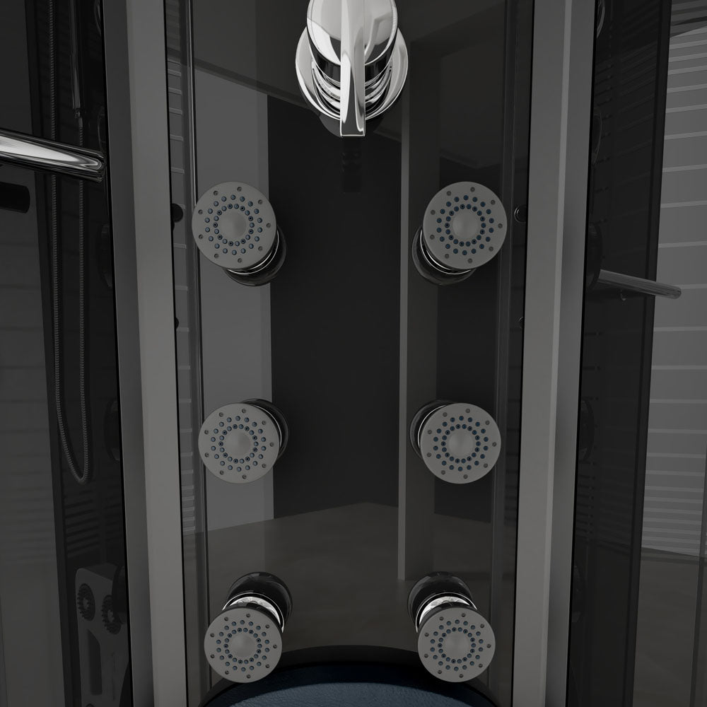 Verliere zum Beispiel nach einem mühsamen Arbeitstag deinen Stress bei einem angenehmen Dampfsaunagang (bis 40 °C einstellbar), bei dem du garantiert ins Schwitzen kommst. Optional besteht für dich die Möglichkeit, ein Duftaroma von himmlischer Intensität (z. B. Eukalyptus, Minze u.v.a.) zu integrieren. Unsere "ONYX-Serie" verfügt außerdem über die Regenbrausenoption, bei der Wasser wie ein lauwarmer Tropenregen aus den unglaublichen 126 Düsen im Deckenhimmel rieselt. Eine entspannte Rückenmassage (6 Hydrojets) mit gleichzeitigem Lauschen deines Lieblingsradiosenders ist bei vielen Kunden beliebt. Selbstverständlich ist auch der gewöhnliche Gebrauch über eine Handbrause, die über die befestigte Duschstange justierbar ist, möglich. Die 15 blauen LED-Lichter im Mittelpaneel machen den "Wohlfühlfaktor" vollkommen. Über das integrierte Computerdisplay kannst du die Lautstärke und Senderwahl stufenlos regeln. Der im Mittelpaneel aufklappbare Sitz (max. Belastung ca. 100 kg) und die Antirutschstruktur im Wannenboden gewährleisten deinen sicheren Gebrauch dieser Duschkabine. Die 5 mm schwarzgetönte ESG-Vollverglasung aller Komponenten steht für unseren durchweg hohen Qualitätsstandard. Die hochmoderne Teilsatinierung schafft sowohl Diskretion als auch Lichtdurchlässigkeit. Die auf fast jeden Untergrund anzupassenden höhenverstellbaren Füße der Duschwanne sind ein weiteres herausragendes Feature, das diese Dusche von anderen hervorhebt.