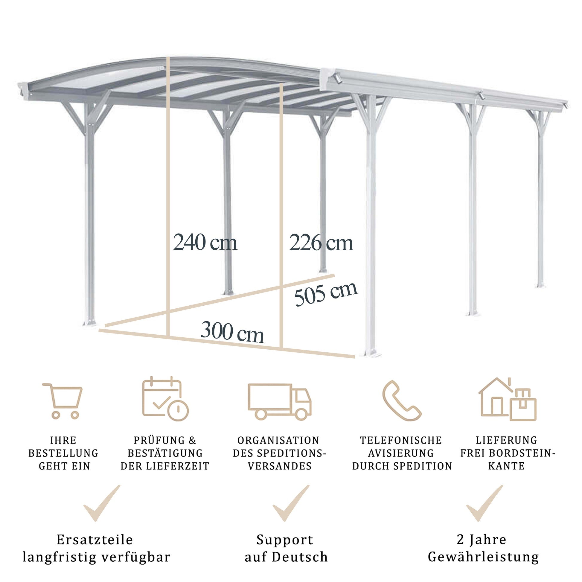 Das moderne und zeitlose Design unseres Carports integriert sich perfekt in die Umgebung und wird dich auch noch nach Jahren begeistern. Ein großer Vorteil der hochwertigen Aluminiumkonstruktion gegenüber teuren Holzcarports ist, dass sie auch nach Jahren noch genauso schön aussieht, wie nach dem Kauf. Außerdem ist das Produkt sehr pflegeleicht und benötigt keinen regelmäßigen neuen Anstrich oder Wartungsarbeiten. Die Pfosten bestehen aus pulverbeschichtetem Aluminium. Dein Fahrzeug ist unter unserem Design Carport bestens vor Regen, Schnee, Wind und Hagel geschützt. Das Material ist korrosionsbeständig und hat eine sehr hohe Lebensdauer. Durch die Doppelstegplatten entsteht keine extreme, aufgestaute Hitze unter dem Carport. Die Stegplatten bestehen aus Polycarbonat und haben folgende positive Eigenschaften: Sie sind frostsicher, wasserfest, haben eine hohe Bruch - und Schlagfestigkeit, Maßhaltigkeit, sind schwer entflammbar und beständig gegen viele Öle, Säuren und Fette, usw. Die Dachplatten verfügen über eine spezielle Beschichtung gegen UV-Strahlung. Diese Schicht verlängert zum einen die Haltbarkeit des Materials deutlich und zum anderen wird die schädliche UV-Strahlung unter dem Carport stark reduziert. Deshalb ist auch bei strahlendem Sonnenschein ein Aufenthalt unter der Überdachung möglich.
