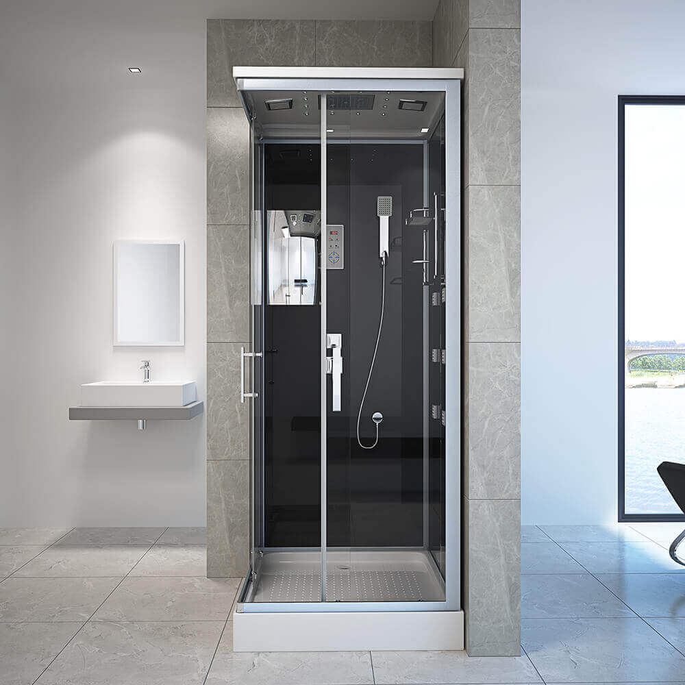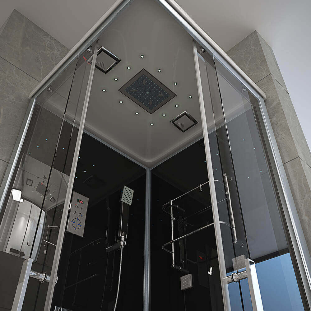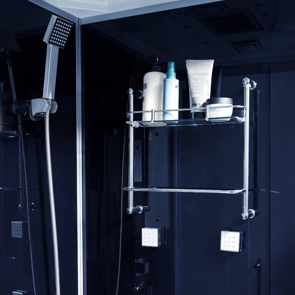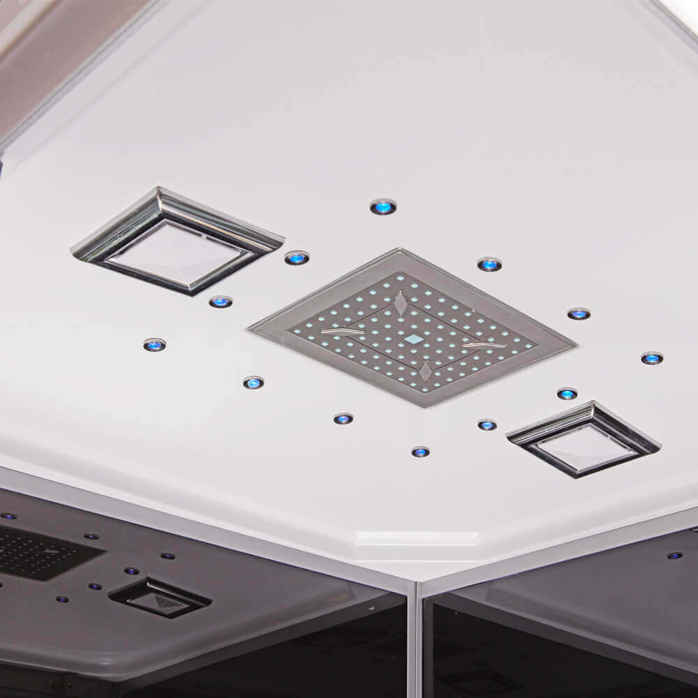 Verliere zum Beispiel nach einem mühsamen Arbeitstag deinen Stress bei einem lauwarmen Tropenregen, der auf dich niederprasselt, oder lausche bei einer entspannten Rückenmassage gemütlich den Klängen deines Radios. Sowohl das wunderschöne LED-Effektlicht im Deckenhimmel als auch die Lautstärke und die Senderwahl sind über das integrierte Computerdisplay stufenlos regelbar. Die ESG Sicherheitsglas-Rückwände und die Klarglas-Schiebetüren, sowie die Aluminium-Rahmenkonstruktion stehen für unseren durchweg hohen Qualitätsstandard. Anders als die anderen Duschkabinen, ist die MIRA rechteckig und besitzt einen individuellen Eckeingang. Das praktische Glasablageregal, der formschöne Innenspiegel und die auf fast jeden Untergrund anzupassenden höhenverstellbaren Füße der Duschwanne sind weitere herausragende Features, die diese Duschkabine von anderen hervorheben.