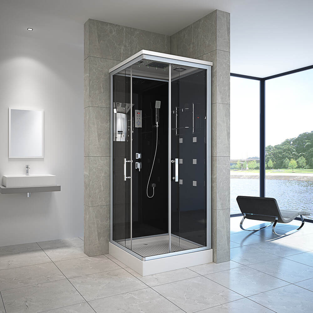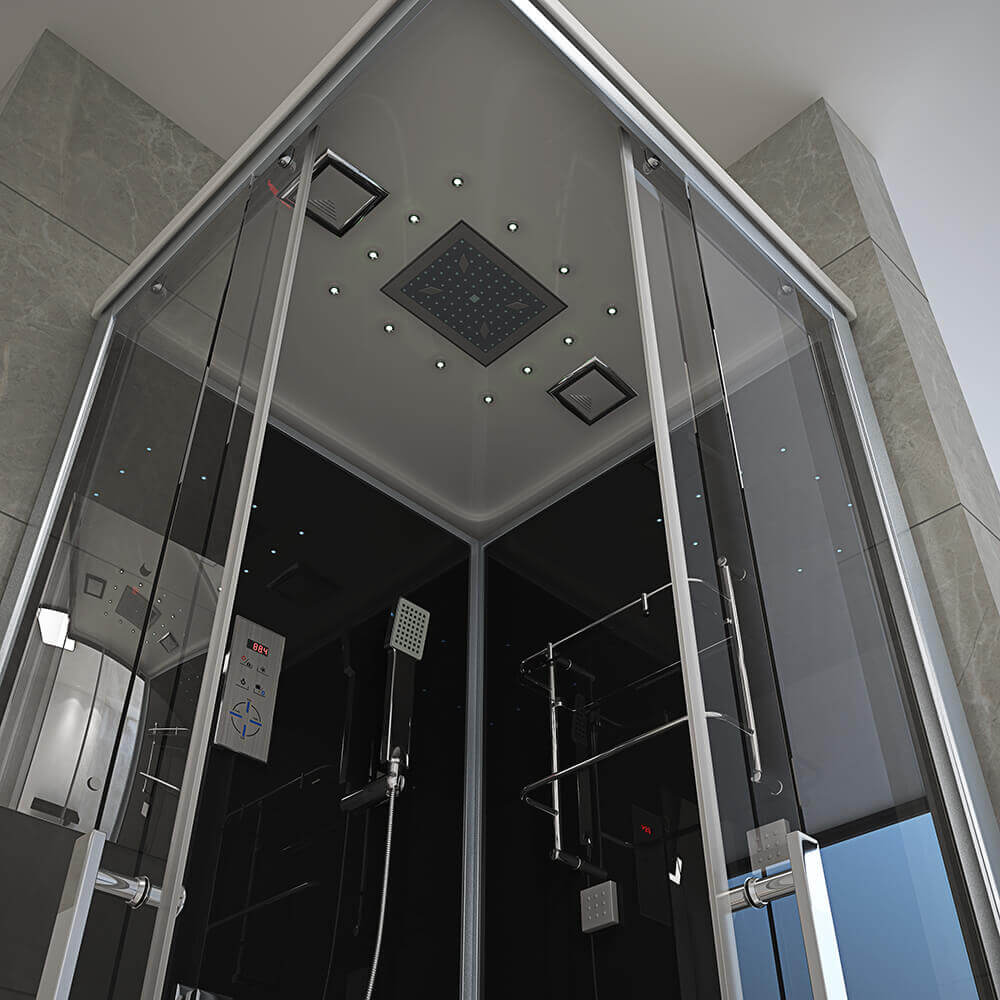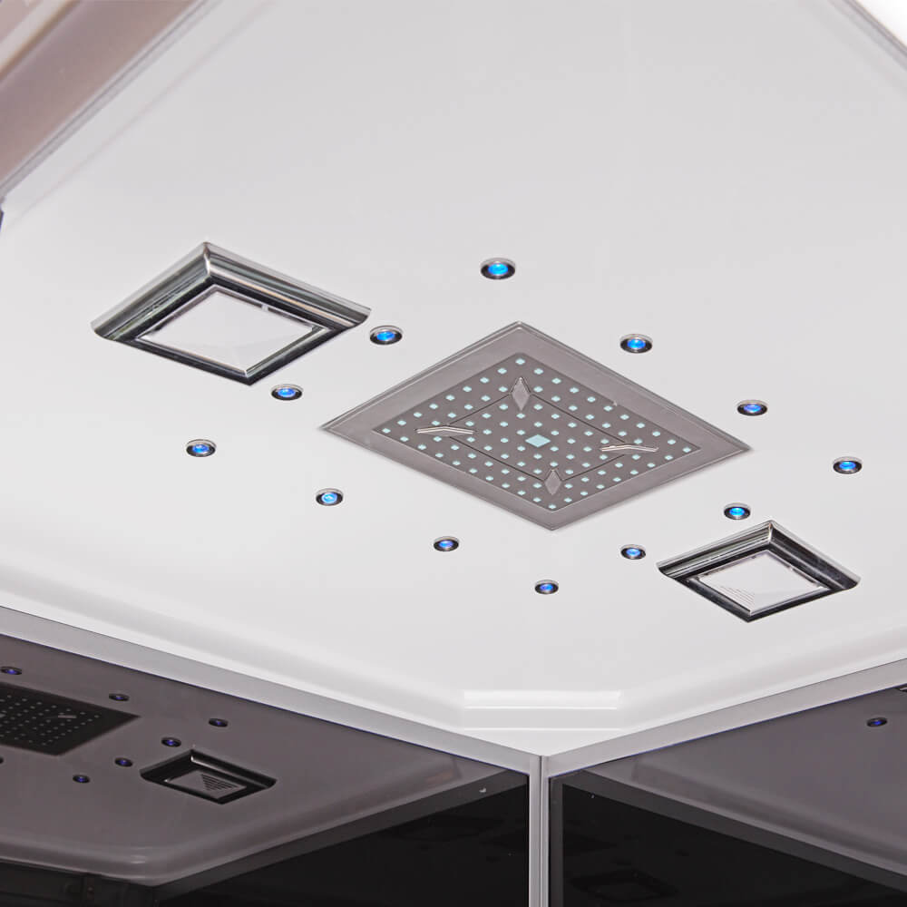 Verliere zum Beispiel nach einem mühsamen Arbeitstag deinen Stress bei einem lauwarmen Tropenregen, der auf dich niederprasselt, oder lausche bei einer entspannten Rückenmassage gemütlich den Klängen deines Radios. Sowohl das wunderschöne LED-Effektlicht im Deckenhimmel als auch die Lautstärke und die Senderwahl sind über das integrierte Computerdisplay stufenlos regelbar. Die ESG Sicherheitsglas-Rückwände und die Klarglas-Schiebetüren, sowie die Aluminium-Rahmenkonstruktion stehen für unseren durchweg hohen Qualitätsstandard. Anders als die anderen Duschkabinen, ist die MIRA M rechteckig und besitzt einen individuellen Eckeingang. Das praktische Glasablageregal, der formschöne Innenspiegel und die auf fast jeden Untergrund anzupassenden höhenverstellbaren Füße der Duschwanne sind weitere herausragende Features, die diese Duschkabine von anderen hervorheben.