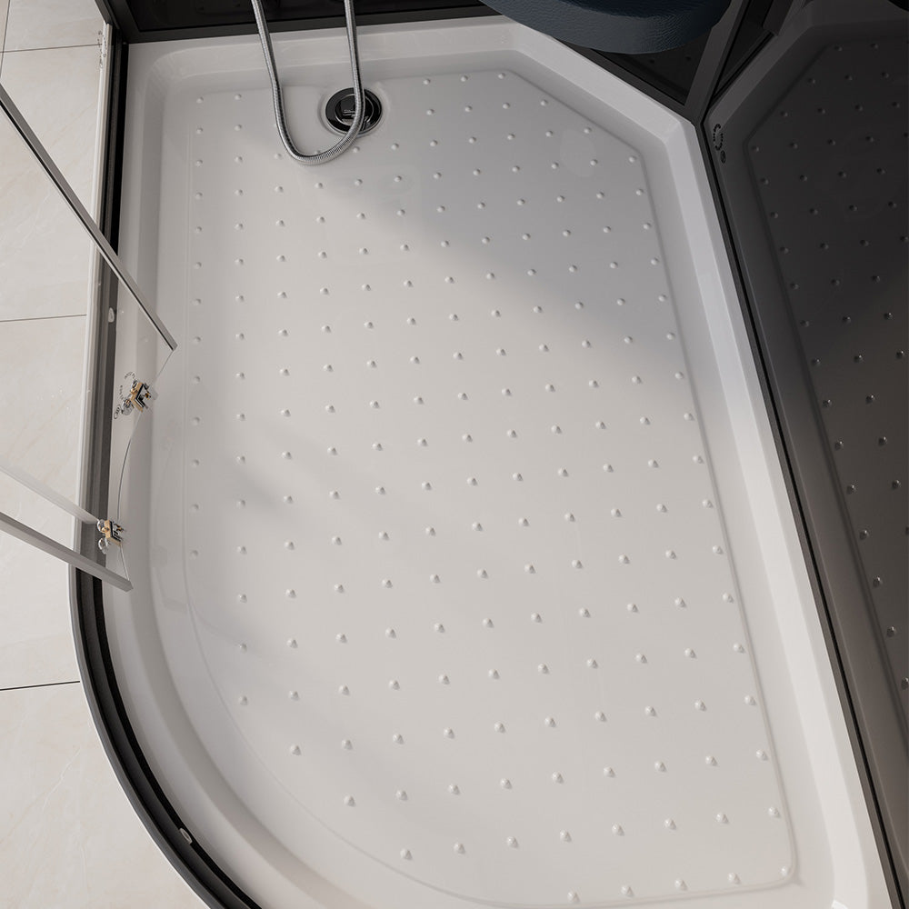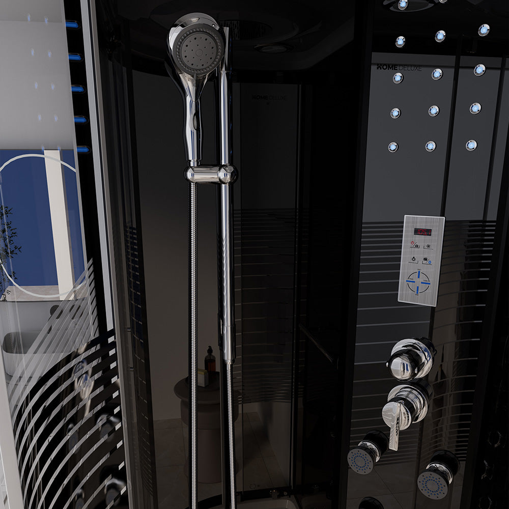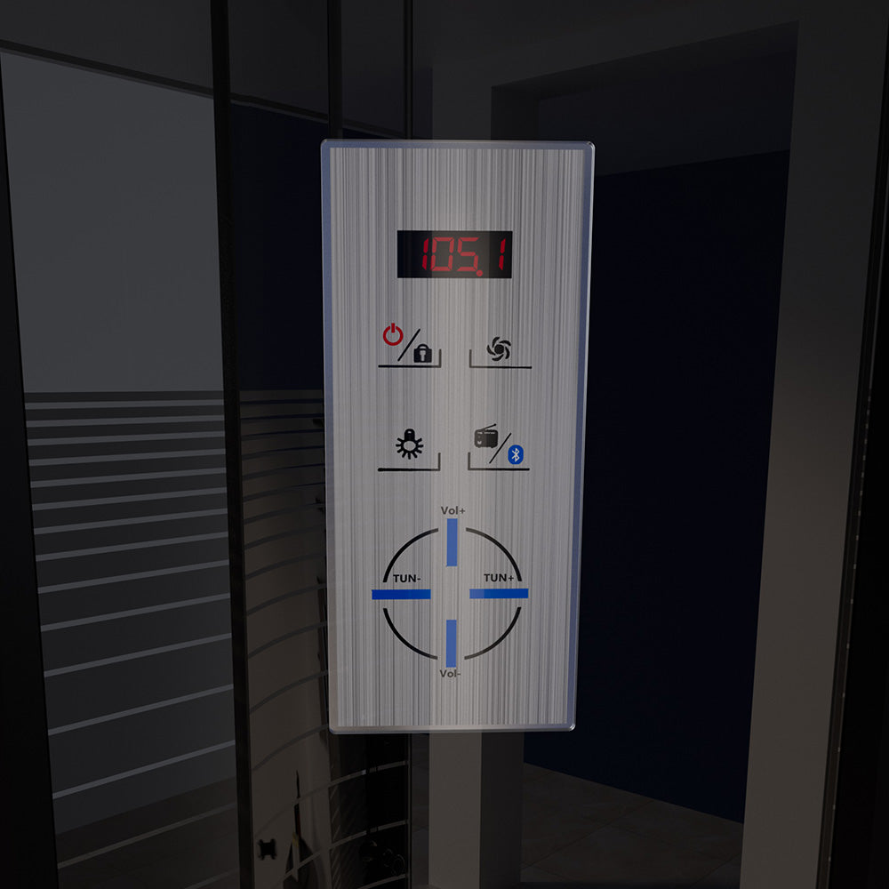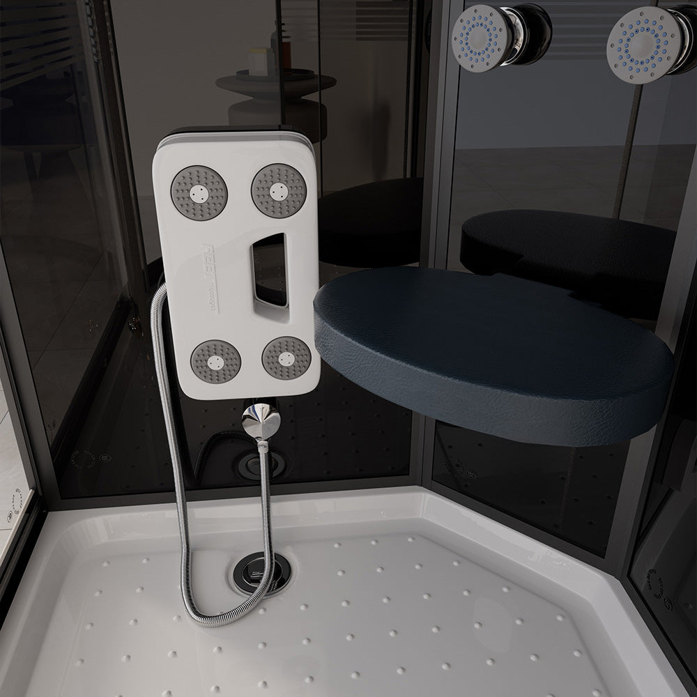 Unsere "ONYX-Serie" bietet dir die Regenbrausenoption, bei der Wasser wie ein lauwarmer Tropenregen aus den unglaublichen 126 Düsen im Deckenhimmel rieselt. Eine entspannte Rückenmassage (6 Hydrojets) mit gleichzeitigem Lauschen deines Lieblingsradiosenders ist bei vielen Kunden beliebt. Selbstverständlich ist auch der gewöhnliche Gebrauch über eine Handbrause, die über die befestigte Duschstange justierbar ist, möglich. Die Handbrause besitzt 3 verschiedene Strahlvarianten, damit kannst du dir die Strahlstärke nach Bedarf einstellen. Die 15 blauen LED-Lichter im Mittelpaneel machen den "Wohlfühlfaktor" vollkommen. Über das integrierte Computerdisplay kannst du die Lautstärke und Senderwahl stufenlos regeln. Der im Mittelpaneel aufklappbare Sitz und die Antirutschstruktur im Wannenboden gewährleisten deinen sicheren Gebrauch dieser Duschkabine. Sowohl die 5 mm ESG-Vollverglasung aller Komponenten als auch die hochmoderne Teilsatinierung stehen für unseren durchweg hohen Qualitätsstandard. Die auf fast jeden Untergrund anzupassenden höhenverstellbaren Füße der Duschwanne sind ein weiteres herausragendes Feature, das diese Duschkabine von anderen hervorhebt.