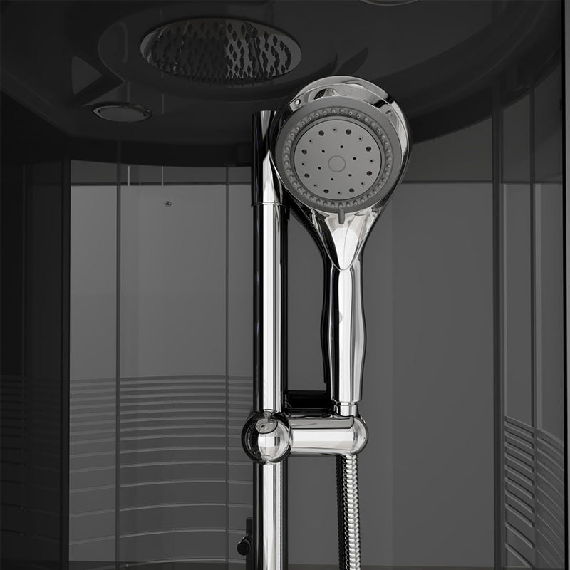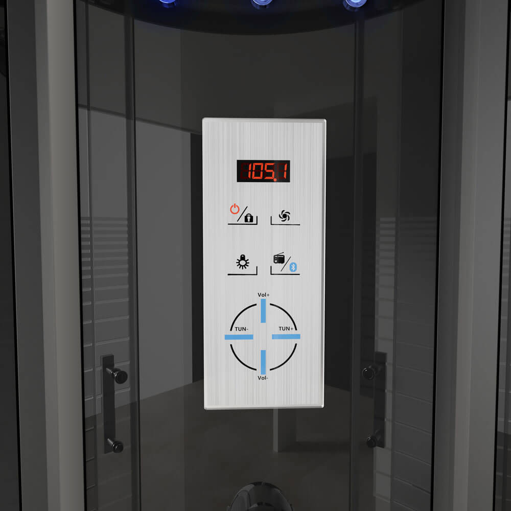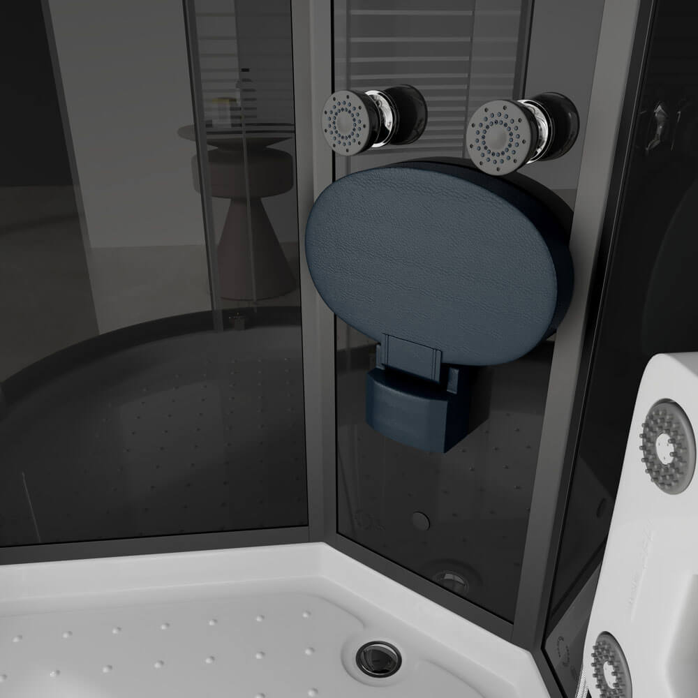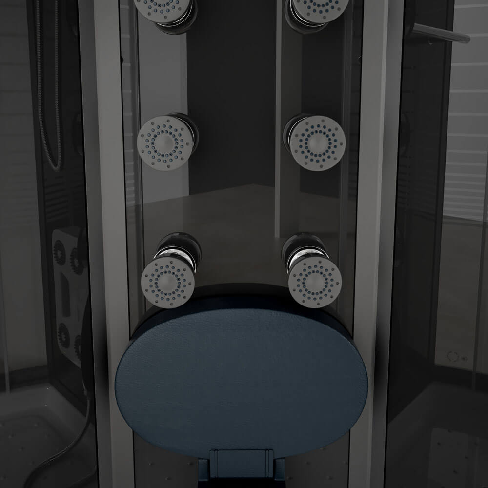 Unsere „ALBA-Serie“ bietet Ihnen die Regenduschen-Variante, bei der Wasser wie lauwarmer Tropenregen aus den unglaublichen 126 Düsen im Deckenhimmel rieselt. Eine entspannende Rückenmassage (6 Hydrojets) beim Hören Ihres Lieblingsradiosenders erfreut sich bei vielen Kunden großer Beliebtheit. Selbstverständlich ist auch die normale Nutzung mit einer Handbrause möglich, die sich über die angebrachte Brausestange verstellen lässt. Die Handbrause verfügt über 3 verschiedene Strahlvarianten, sodass Sie die Strahlstärke je nach Bedarf anpassen können. Die 15 blauen LED-Leuchten im Mittelteil runden den „Wohlfühlfaktor“ ab. Über das integrierte Computerdisplay können Sie die Lautstärke und die Senderauswahl stufenlos anpassen. Der Klappsitz im Mittelteil und die Anti-Rutsch-Struktur im Wannenboden sorgen für eine sichere Nutzung dieser Duschkabine. Sowohl die 4 mm ESG-Vollverglasung aller Bauteile als auch die hochmoderne Teilsatinierung stehen für unseren gleichbleibend hohen Qualitätsanspruch. Ein weiteres herausragendes Merkmal, das diese Duschkabine von anderen abhebt, sind die höhenverstellbaren Füße der Duschwanne, die sich an fast jeden Untergrund anpassen lassen.