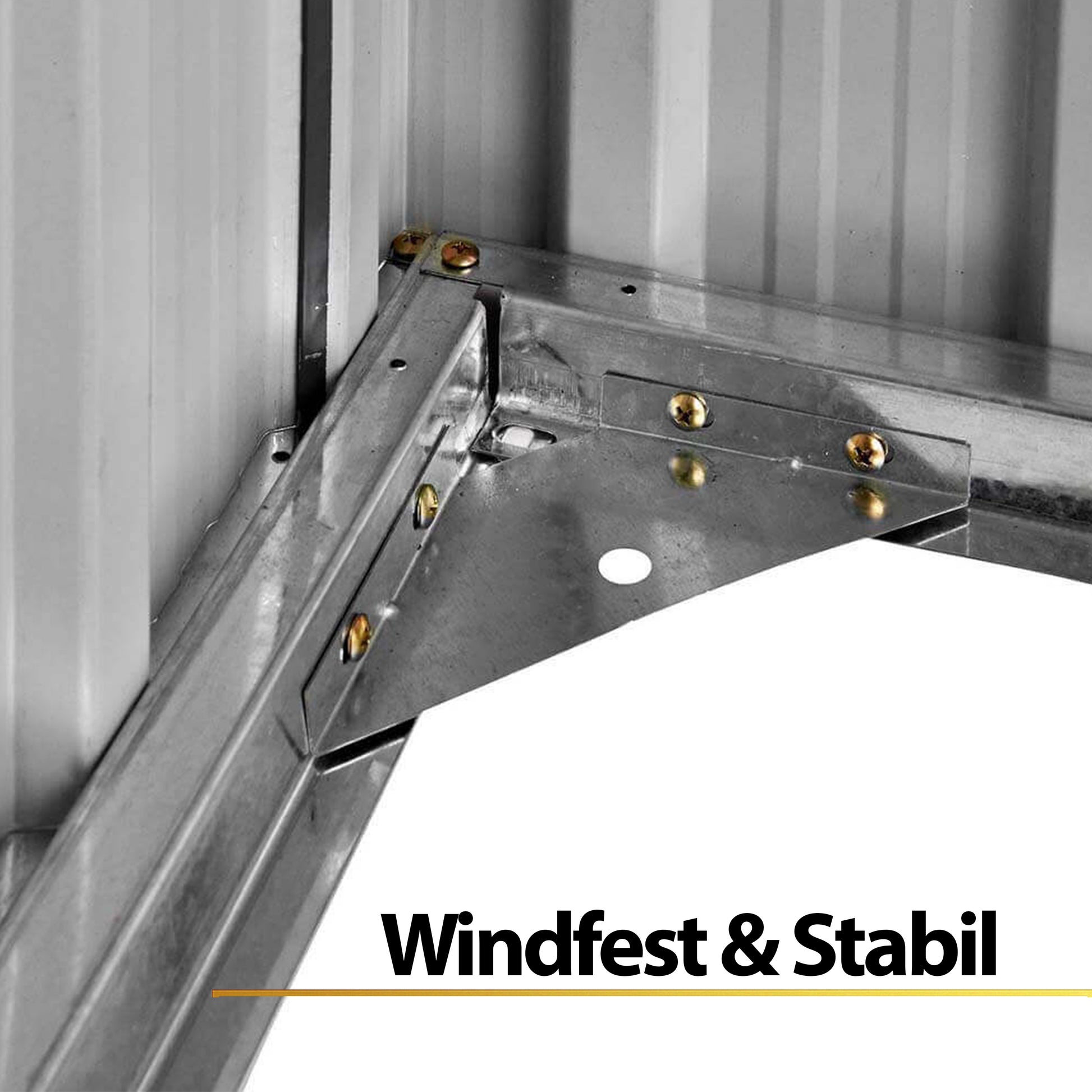 Das Gerätehaus ist nicht nur pflegeleicht, sondern langlebig. Durch den Aufbau aus verzinkten Stahlwänden ist der Metallschuppen nicht nur belastbar, sondern auch witterungsbeständig. Frost, Schnee, Regen und Rost können dem Gerätehaus, aufgrund seiner hervorragenden Materialbeschaffenheit nichts anhaben.