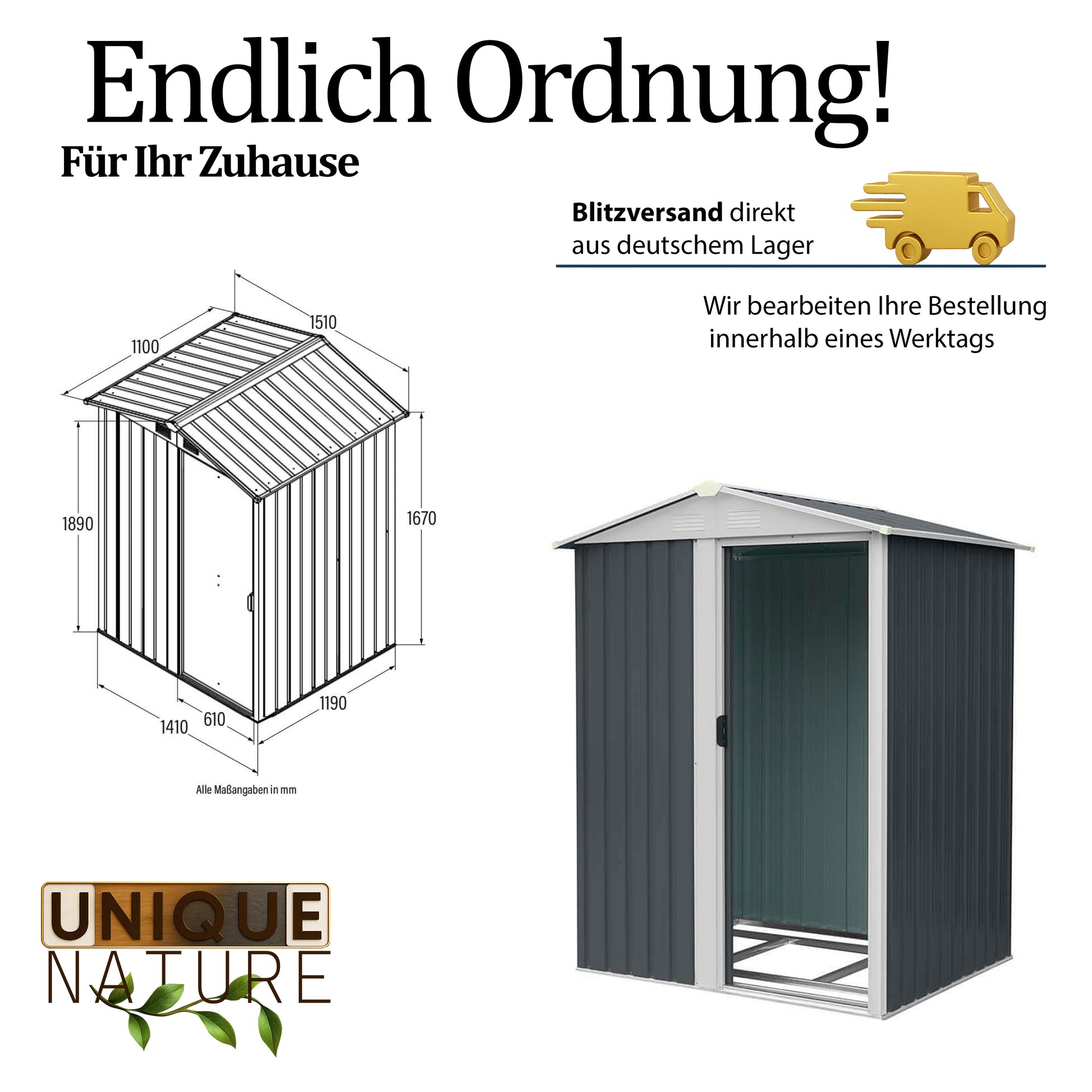 - Gesamtmaße inkl. Dachüberstand (B x L x H): 151 x 110 x 189 cm