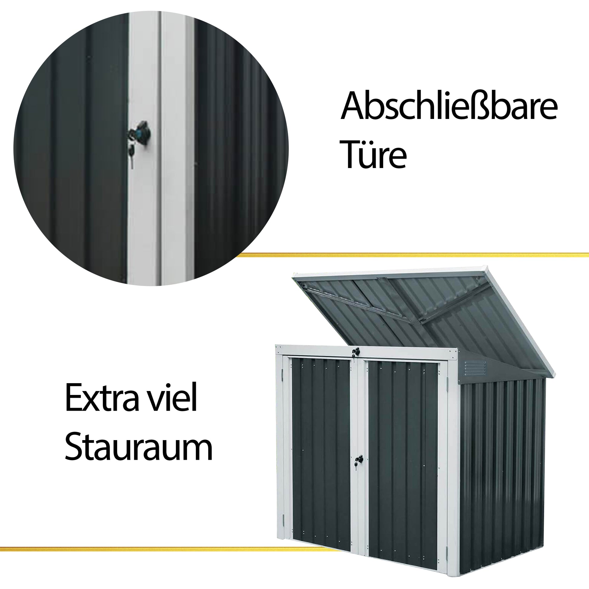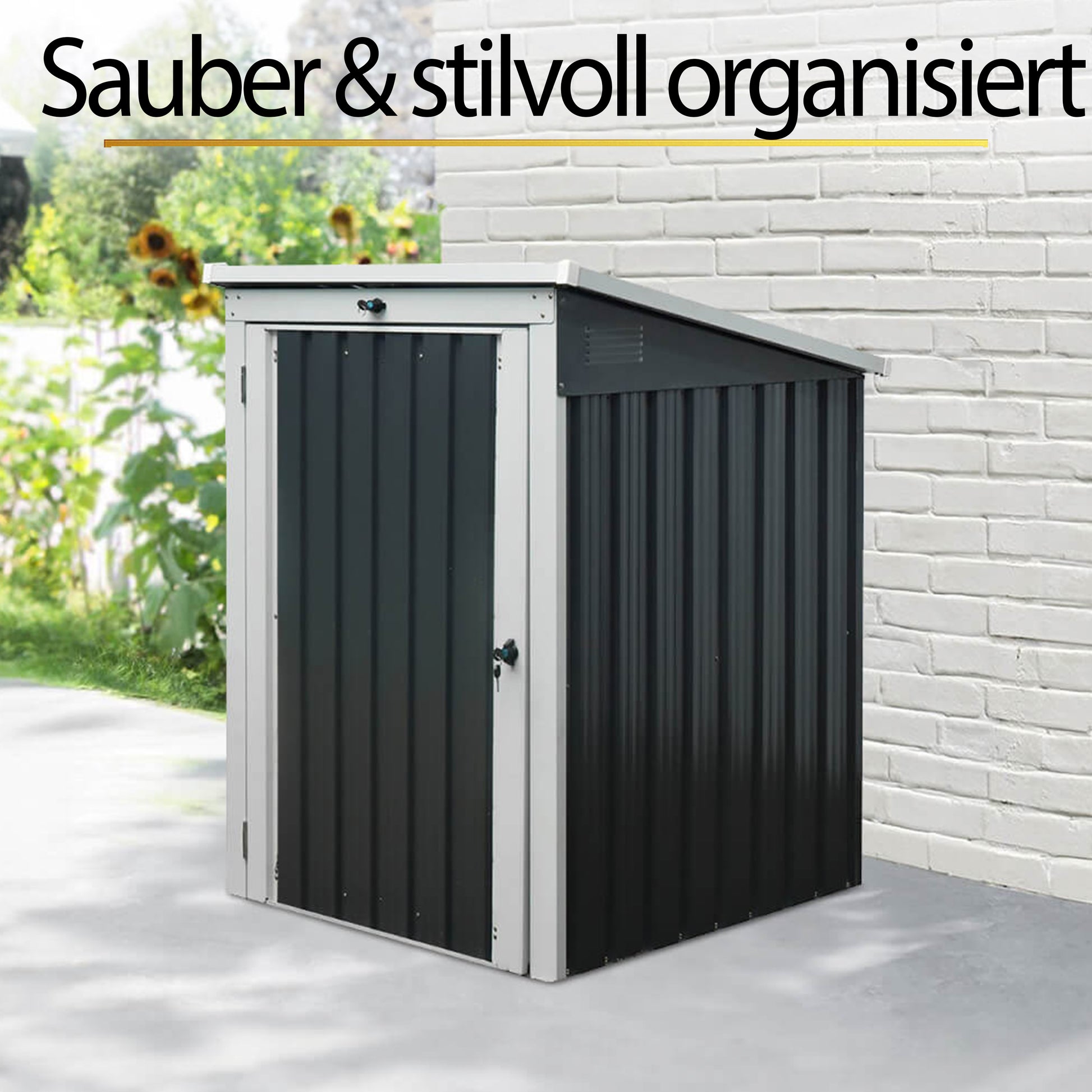 Neben der verbesserten Optik bietet die Mülltonnenbox, zuverlässig Schutz vor Witterung und Tieren. Innerhalb unserer Mülltonnenverkleidung bleibt der Müll kühl und trocken, sodass die Geruchsbildung nicht erfolgen kann und keine unerwünschten Gäste angelockt werden. Das Belüftungssystem besteht aus Lüftungsschlitzen an jeweils beiden Seiten. Diese sorgen dafür, dass die Luft optimal zirkuliert wird. Mithilfe der verbauten Gasdruckfeder lässt sich das Dach der Metallbox geschmeidig, einfach und einhändig öffnen, sowie schließen. Zusätzlich ist das Dach, sowie die Flügeltüren mit jeweils einem Schloss versehen und bieten somit den optimalen Schutz vor Diebstahl. Die verbauten Flügeltüren lassen sich nach außen öffnen, daher kannst du deine Mülltonnen, Fahrräder, Auflagen und vieles mehr ohne großen Aufwand verstauen oder entnehmen. Ein weiterer Vorteil ist das Pultdach, dieses ist enorm platzsparend. Darüber hinaus läuft Schmelz - und Regenwasser auf der Rückseite der Mülltonnenbox ab.