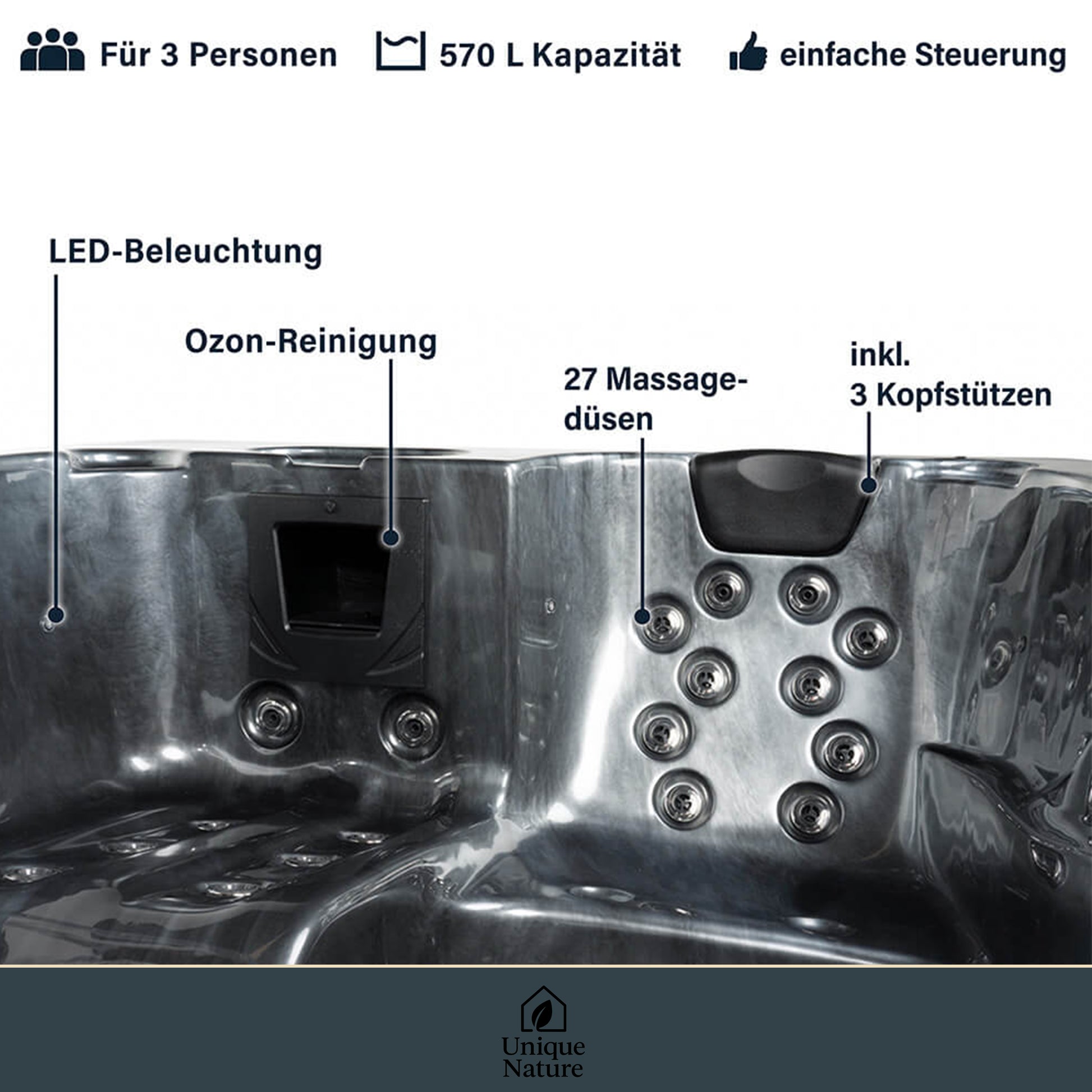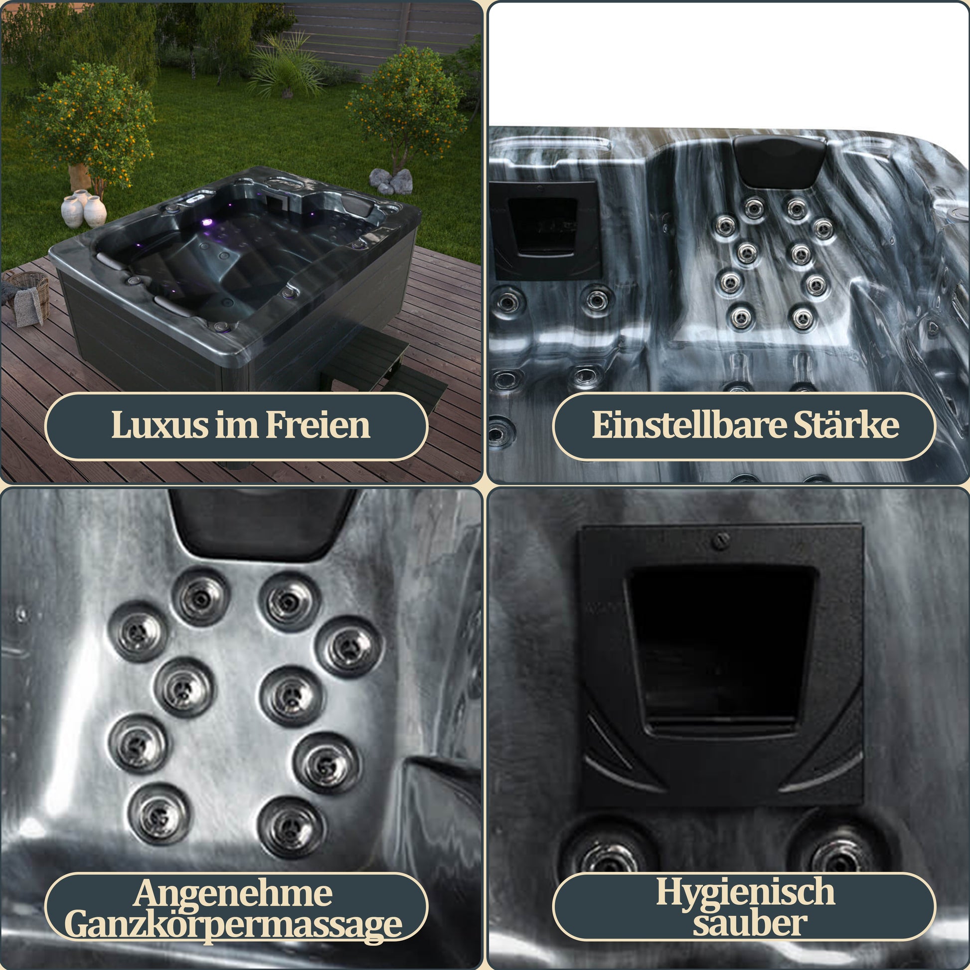Der Arctis Whirlpool bringt dir Entspannung genau dorthin, wo du sie brauchst – in den Garten, auf die Terrasse oder in den Wintergarten. Mit 27 kräftigen, individuell einstellbaren Düsen genießt du eine intensive Massage genau nach deinem Geschmack. Die schicke Marmoroptik der Wanne und die wetterfeste WPC-Verkleidung in Dunkelgrau machen den Pool nicht nur pflegeleicht, sondern auch zum echten Hingucker. Dank kompakter Größe passt er fast überall hin. Für stimmungsvolle Abende sorgen neun integrierte Lichtquellen mit Farbwechsel. Drei bequeme Kopfstützen machen das Sitzen oder Liegen noch angenehmer. Über das Bedienfeld steuerst du alles bequem direkt am Pool – von der Temperatur über die Massagedüsen bis zur Beleuchtung. Die leistungsstarke Pumpe lässt sich zweistufig einstellen. Insektenschutz und ein passendes Filtersystem sind bereits dabei. Der Arctis wird als Komplettset inklusive Treppe und passender Thermoabdeckung geliefert – alles drin, sofort startklar. Die hochwertige Ausstattung, einfache Bedienung und durchdachten Details machen ihn zur perfekten Wahl für dein privates Spa-Erlebnis.