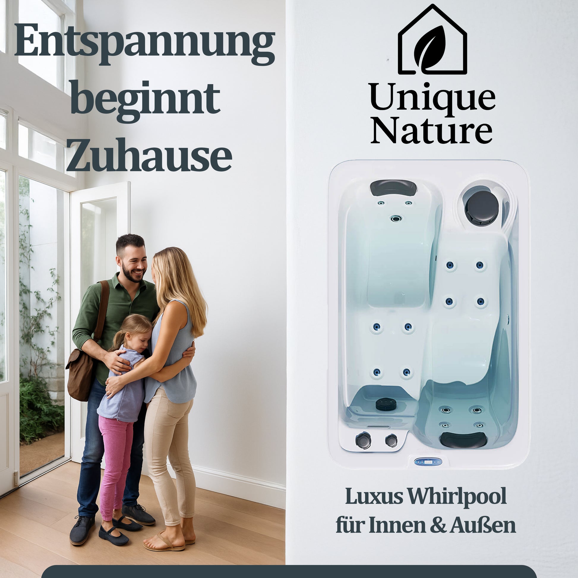 Stell dir vor, wie du nach einem langen, hektischen Tag direkt in deinem eigenen Garten in pure Entspannung eintauchst. Mit dem Outdoor Whirlpool Aureon wird dieser Traum Wirklichkeit – ganz unkompliziert und jederzeit für dich verfügbar. Erlebe Wellness auf höchstem Niveau und mach deinen Garten zu deinem persönlichen Erholungsraum.