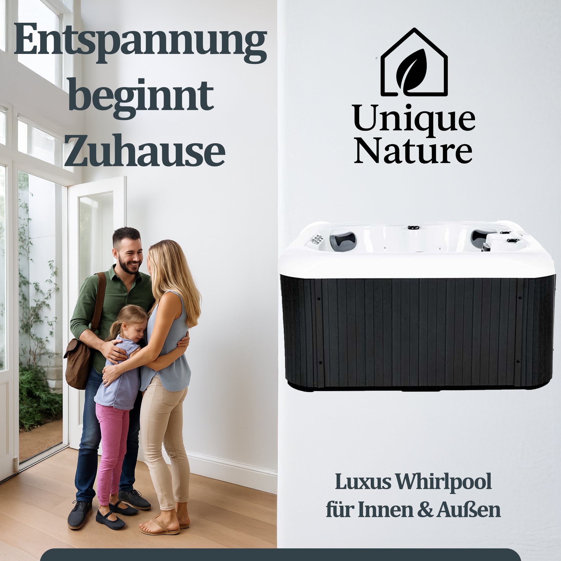 Ein echter Blickfang ist die dunkelgraue Außenverkleidung aus strapazierfähigem WPC (naturfaserverstärkter Kunststoff), die diesem Whirlpool einen besonderen Charakter verleiht. Dieses Material bietet viele Vorteile: Es ist langlebig, Temperatur- und Formbeständig, wasserfest, schwer entflammbar, hygienisch und leicht zu reinigen. Zudem bleibt es auch bei Sonneneinstrahlung farbecht, was gerade bei Gartenartikeln oft ein Problem darstellt. Unterschiedliche Strukturen der Verkleidung sorgen für das gewisse Extra. Aufgrund seiner kompakten Maße passt der Pool in nahezu jeden Garten und bietet Platz für bis zu 4 Personen. Du kannst ihn auch auf Terrassen oder in Wintergärten platzieren und so das hochwertige Design und die Technologie genießen.