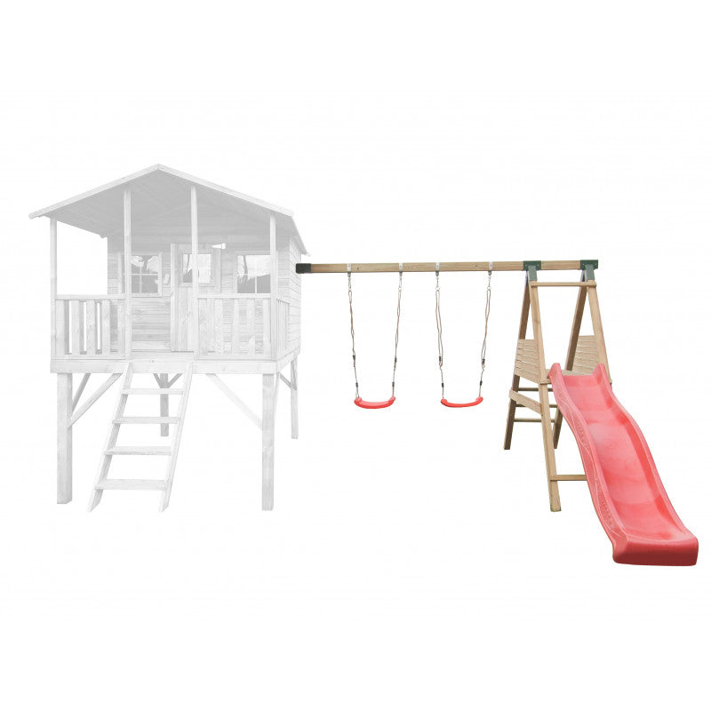 • Ausstattung: Tür mit Fenster; 2 Fenster mit transparenter Plexiglasscheibe; Doppelschaukel; Plattform; Rutsche; überdachte Terrasse mit Geländer; Dachpappe; Montageset & Anleitung