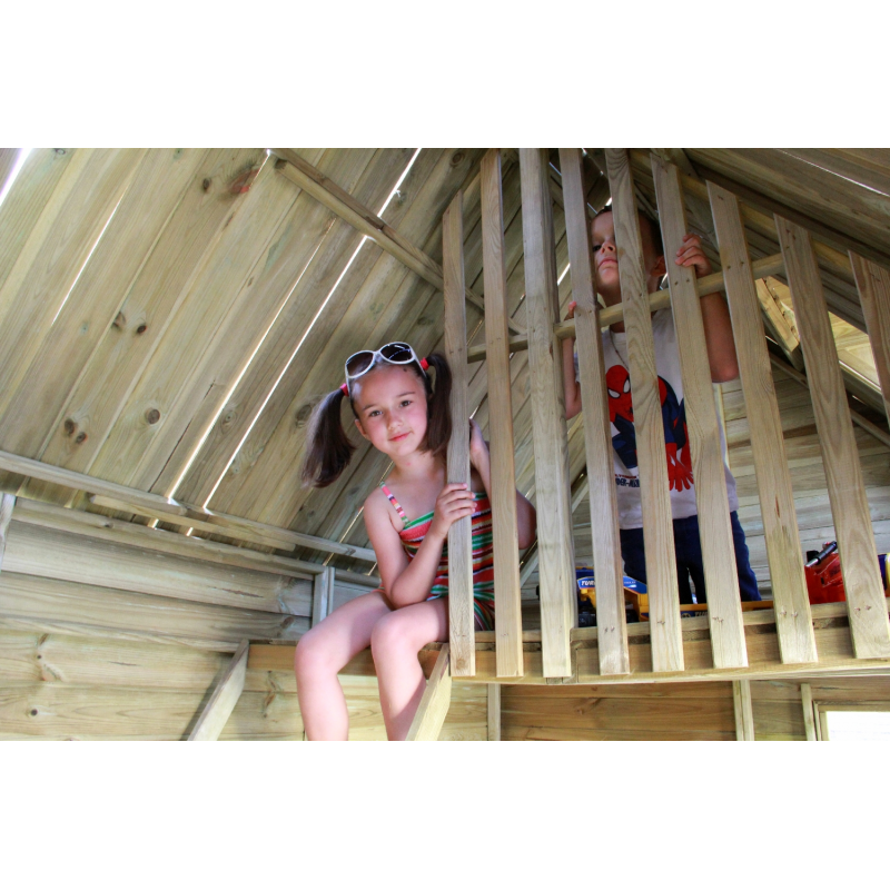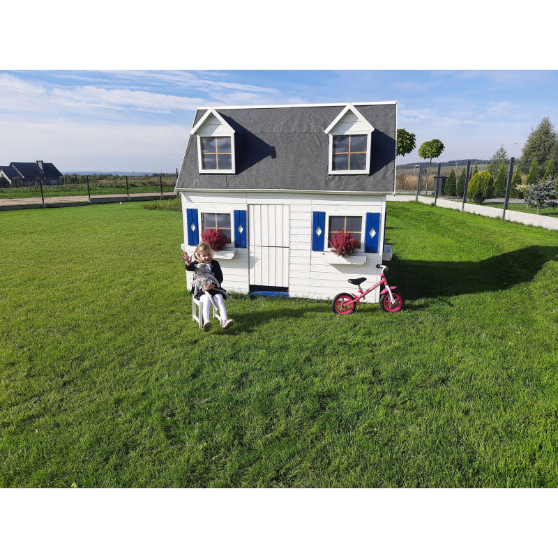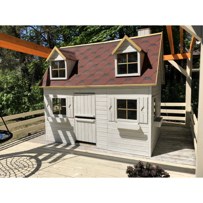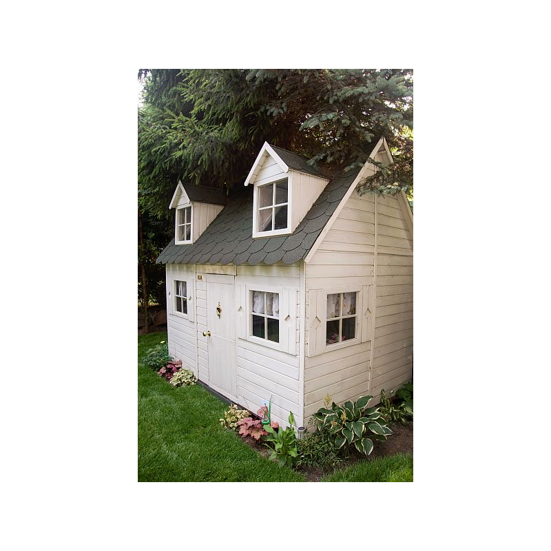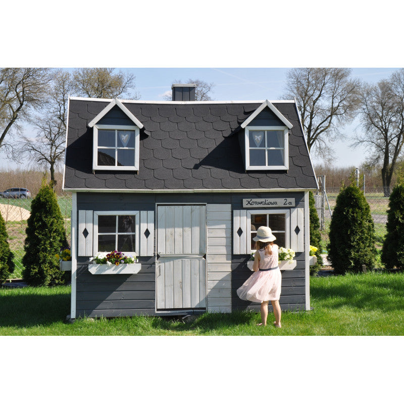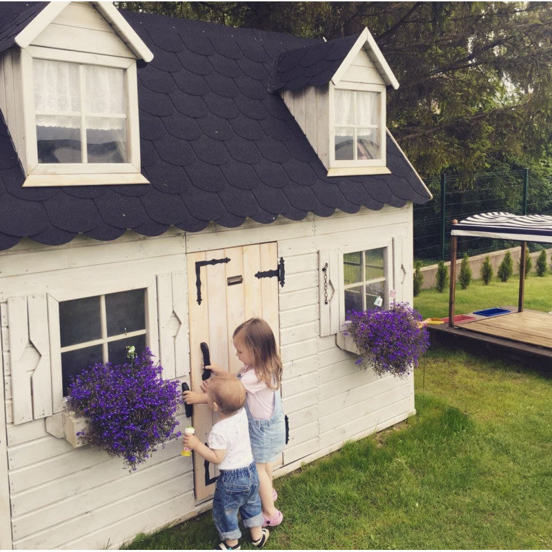 Das Modell wurde TÜV Rheinland-geprüft und erfüllt die EN71-Sicherheitsnorm für Kinderspielgeräte. Es bietet höchsten Spielkomfort und lässt sich individuell gestalten – ob naturbelassen, farbig gestrichen oder mit kreativen Mustern dekoriert. Optional kann das Dach mit Bitumenschindeln in Anthrazit, Rot oder Grün aufgewertet werden, um zusätzlichen Witterungsschutz zu bieten.