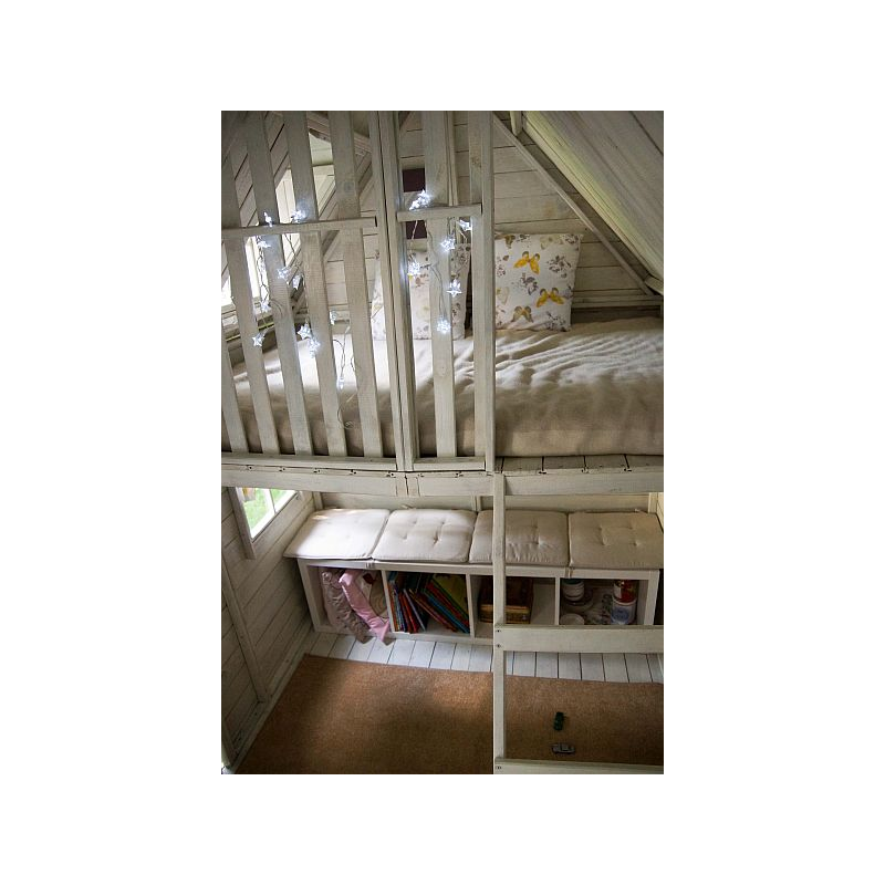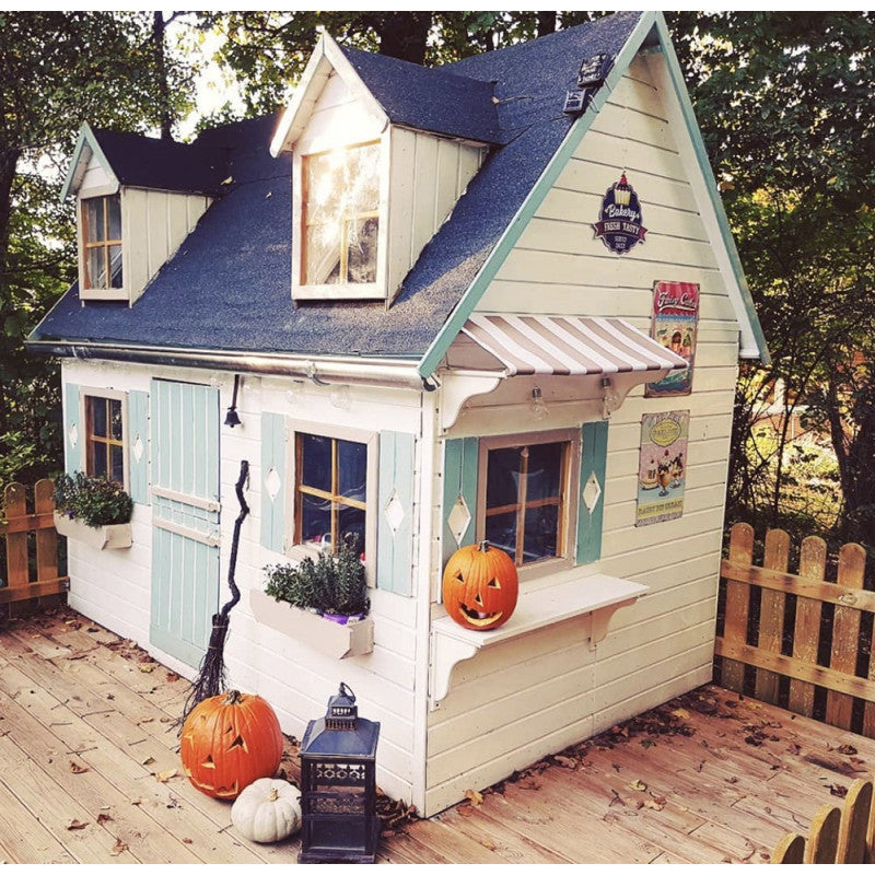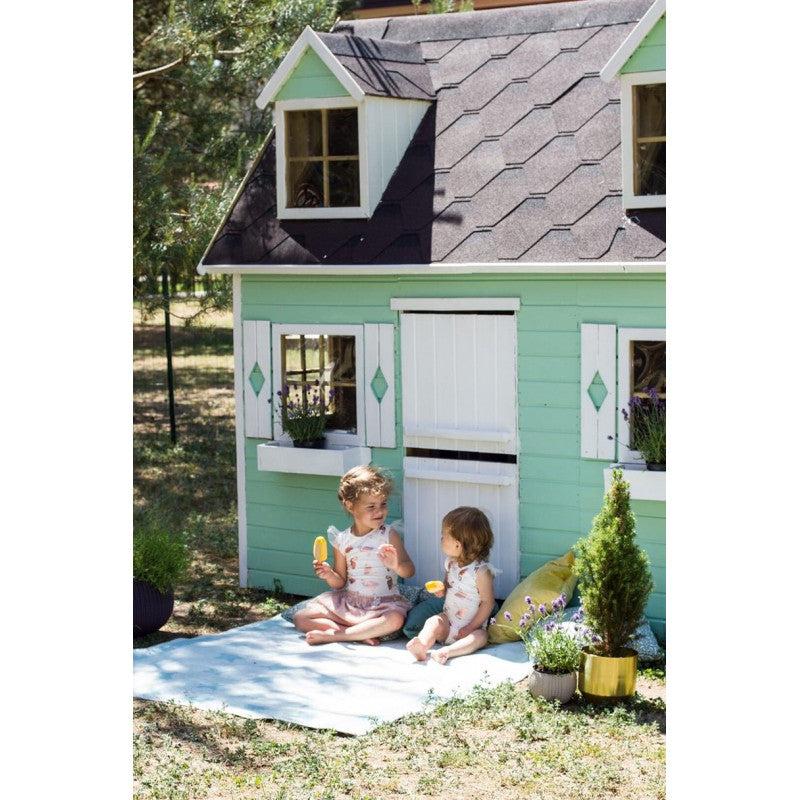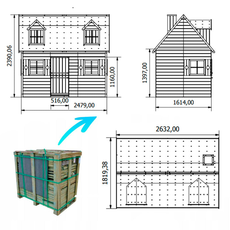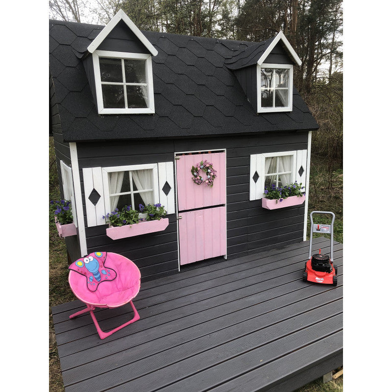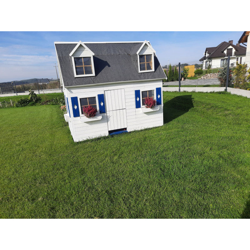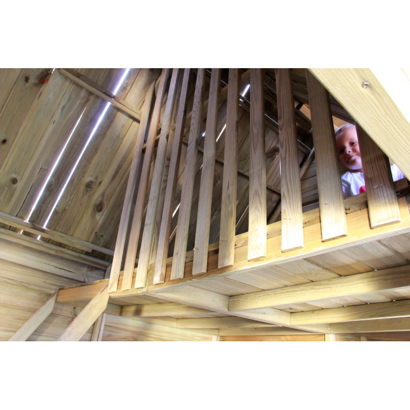 Das Modell wurde TÜV Rheinland-geprüft und erfüllt die EN71-Sicherheitsnorm für Kinderspielgeräte. Es bietet höchsten Spielkomfort und lässt sich individuell gestalten – ob naturbelassen, farbig gestrichen oder mit kreativen Mustern dekoriert. Optional kann das Dach mit Bitumenschindeln in Anthrazit, Rot oder Grün aufgewertet werden, um zusätzlichen Witterungsschutz zu bieten.