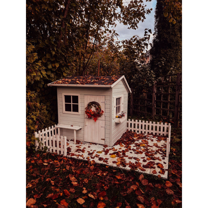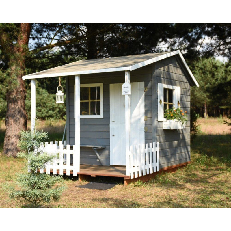 Das Spielhaus verfügt über eine überdachte Terrasse, eine integrierte Bank, doppelte Türen (oben und unten) sowie zwei feste Fenster mit bruchsicherem Plexiglas. Der Boden sorgt für Isolation vom Untergrund und erhöht die Haltbarkeit. Die Lieferung erfolgt mit Montageset, Schrauben, Verbindungselementen und Dachpappe.