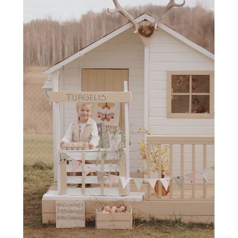 Das Haus steht direkt auf dem Boden – ohne Leiter oder Podest – und ist damit ideal für kleine Kinder. Durch die stabile Bauweise und den durchdachten Aufbau ist das Spielhaus sowohl für jüngere als auch ältere Kinder geeignet. Drei feste Fenster aus bruchsicherem Plexiglas, eine Tür und ein robuster Holzboden machen es zu einer komfortablen und sicheren Spielumgebung.