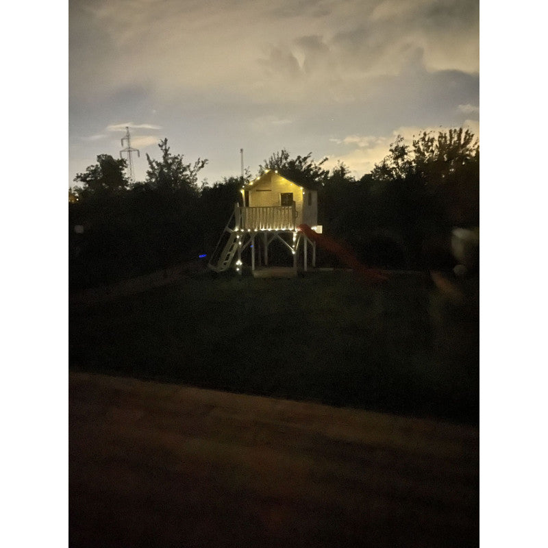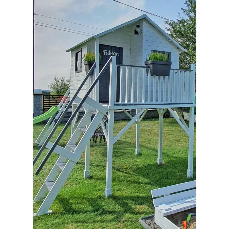 Das hohe Spielhaus „Tayo“ schafft einen geschützten Ort für fantasievolles Spielen im Garten oder auf der Datscha. Die Konstruktion aus gehobelter, druckimprägnierter Kiefer steht auf einer Plattform in 150 cm Höhe und ist für Kinder ab 3 Jahren geeignet. Für Komfort und Sicherheit sorgen drei feste Fenster mit transparenter, bruchsicherer Plexiglasscheibe, Tür, Boden und eine Leiter – ergänzt um Griffhalter (Farbe wird zufällig zugeteilt). Die Rutsche mit 3 m Länge besteht aus widerstandsfähigem HDPE und bietet rasanten Spielspaß.