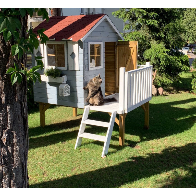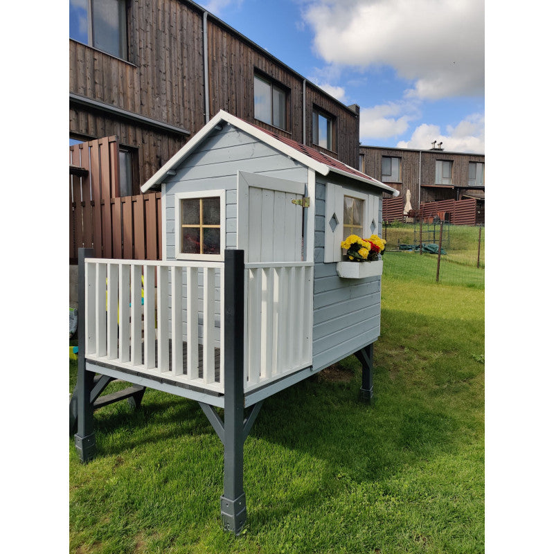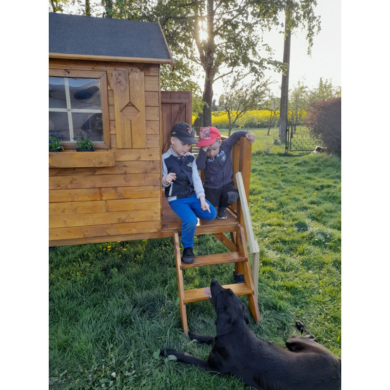 Zur Ausstattung gehören eine Tür, zwei feste Fenster mit transparenter Plexiglasscheibe (41 × 41 cm), eine Pflanzkiste, Boden, sowie schwarze Dachpappe und das komplette Montageset. Das Haus steht auf einem Podest mit 57 cm Höhe – ideal für den Überblick und zusätzlichen Spielspaß.