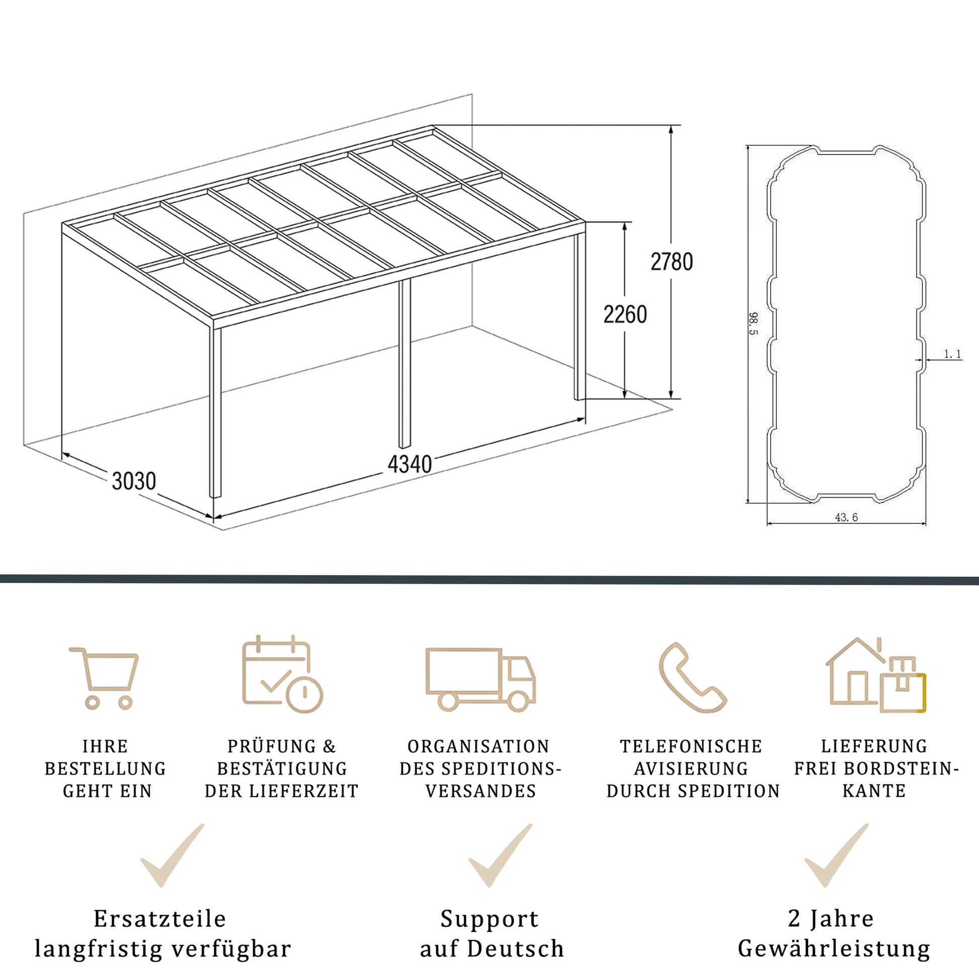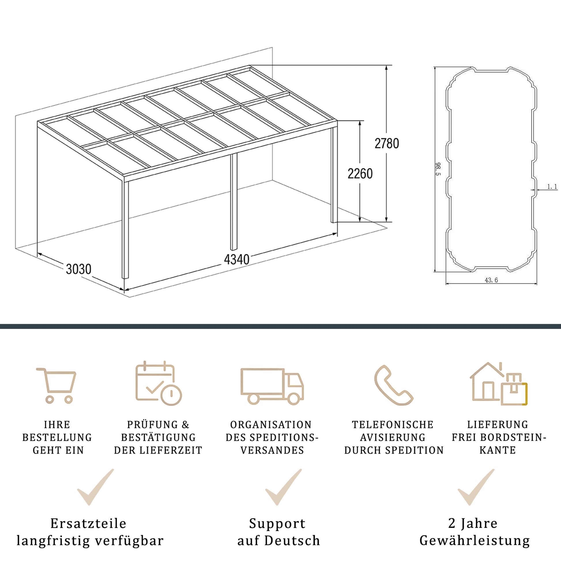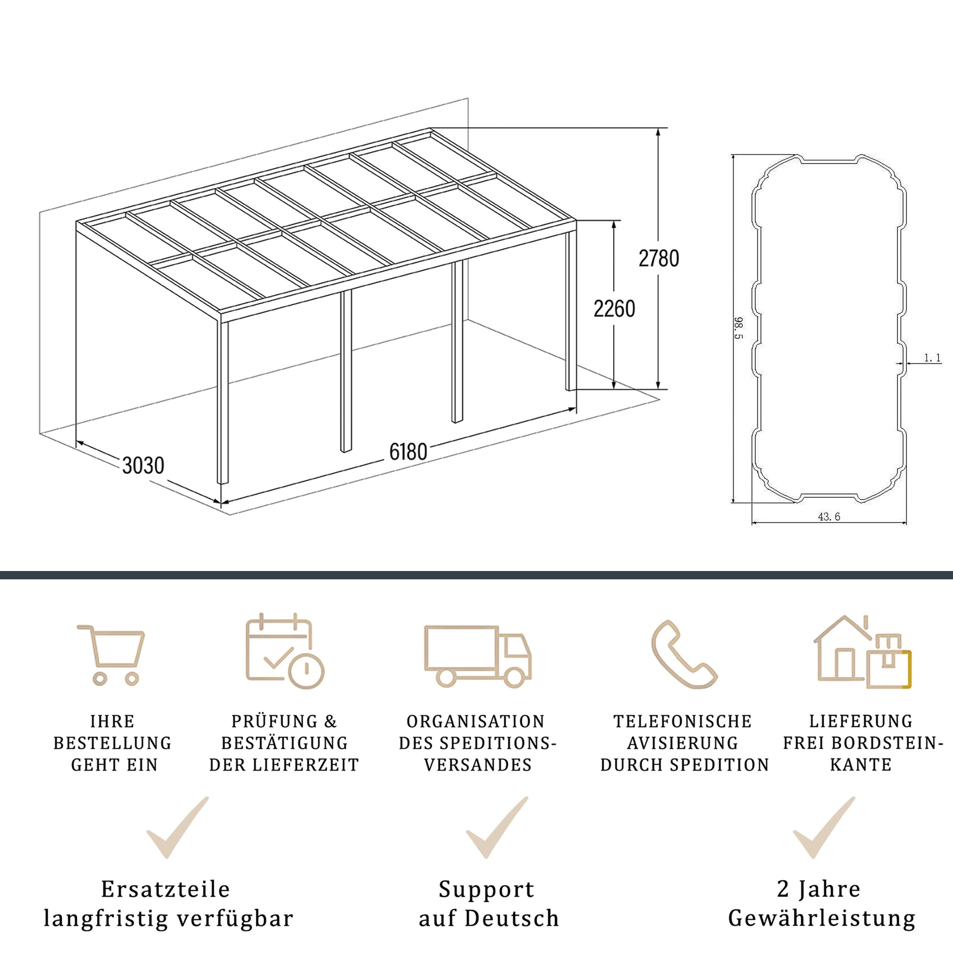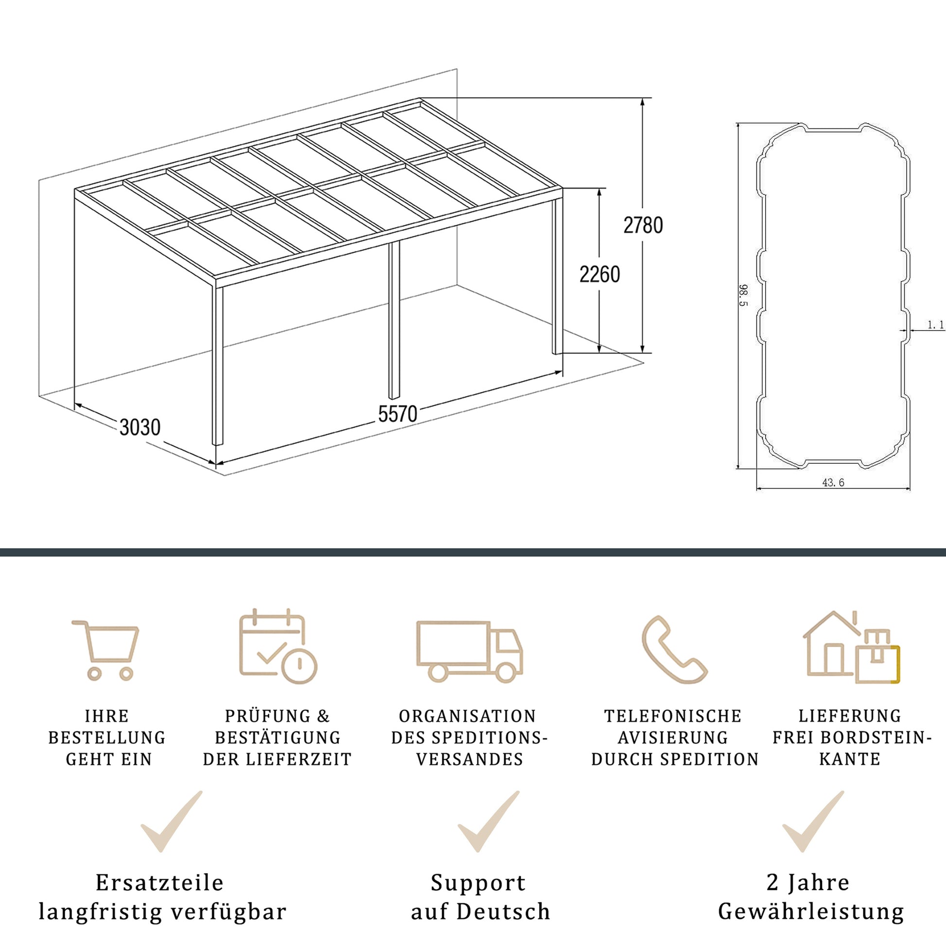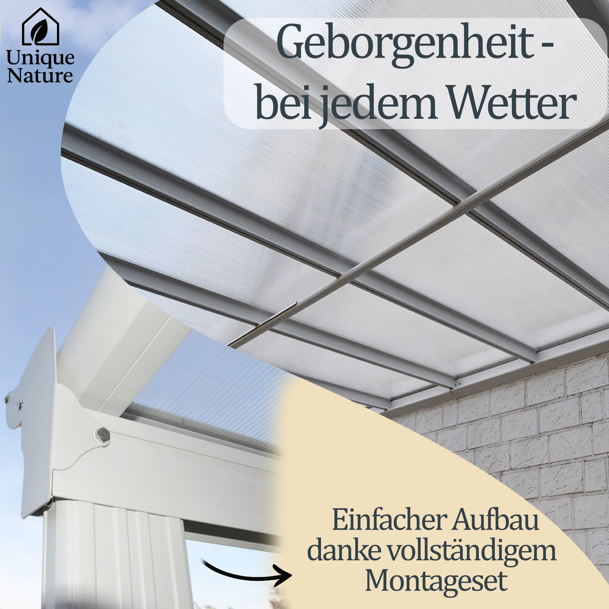 Dieses Modell beeindruckt durch sein schickes Design und einen erschwinglichen Preis, ohne Abstriche bei der Qualität zu machen. Die robusten Hohlkammerplatten sind frostsicher, wasserfest, schlag - und bruchfest, maßhaltig, schwer entflammbar und beständig gegen viele Öle, Säuren und Fette. Besonders hervorzuheben ist die hohe Transparenz und die UV-beständige Beschichtung für lange Haltbarkeit. Verpasse nicht die Chance, deine Terrasse mit LUNARA zu verschönern - die Plätze unter dieser Terrassenüberdachung sind heiß begehrt.