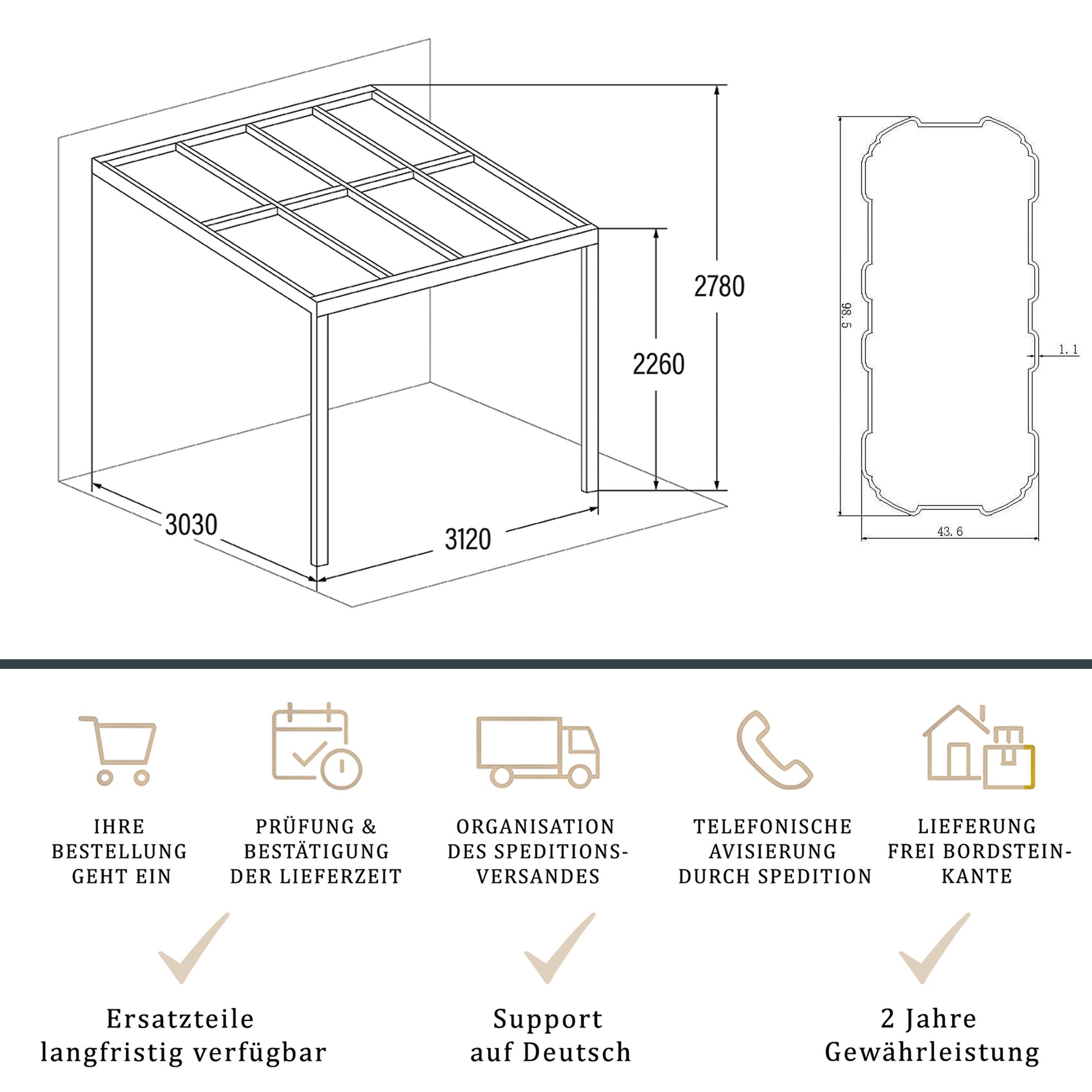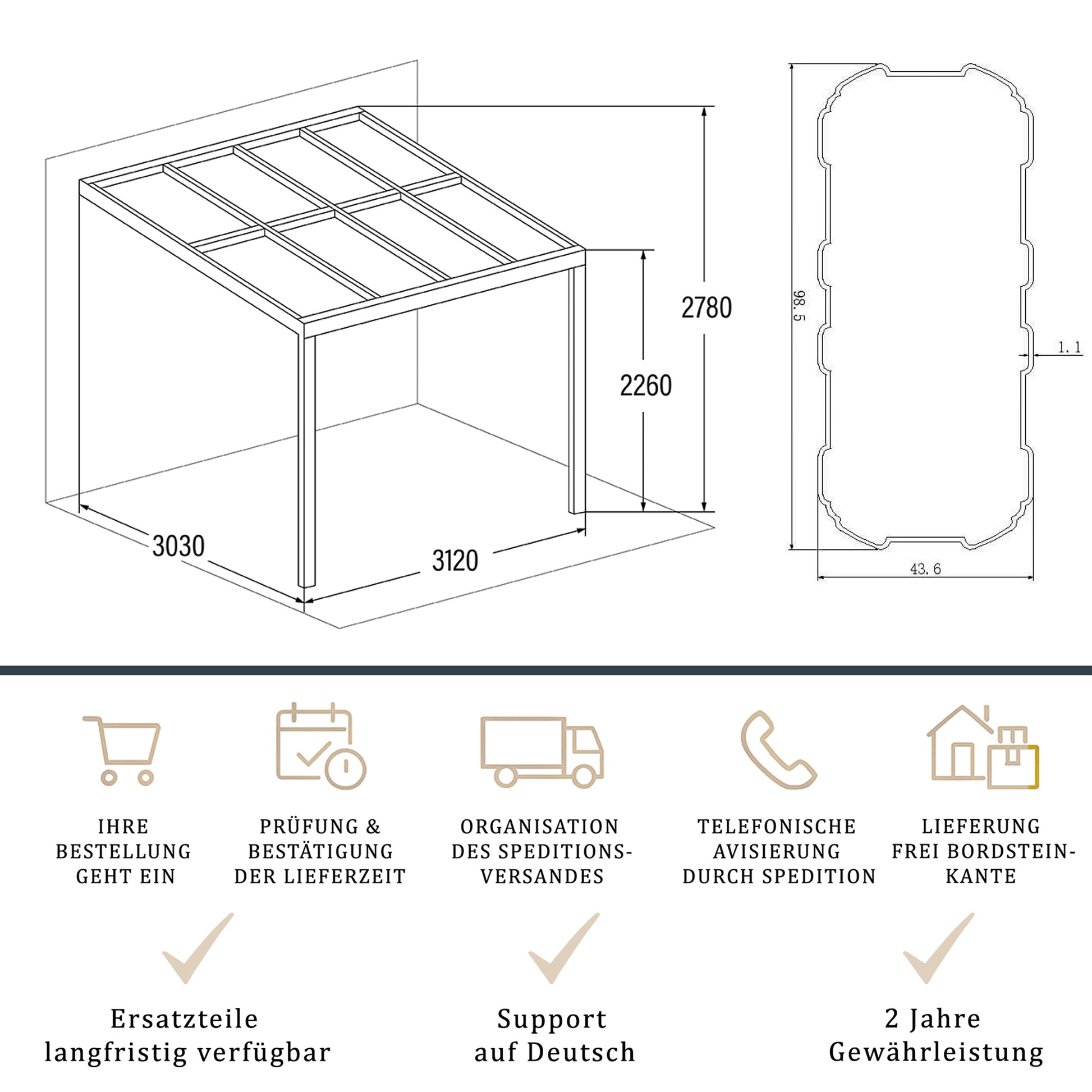 - Pfosten, Pfetten, Sparren: Pulverbeschichtetes Aluminium in 1,1 mm Materialstärke