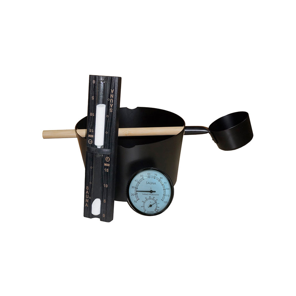 - 1 x Zubehör komplett (Saunasteine, Kelch, Kelle, Sanduhr und Thermometer)